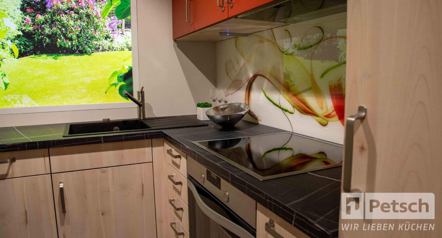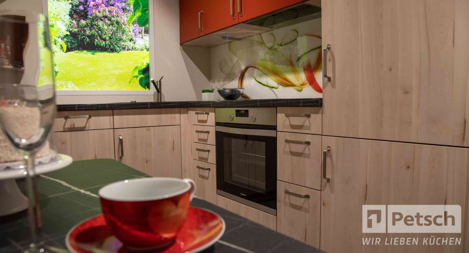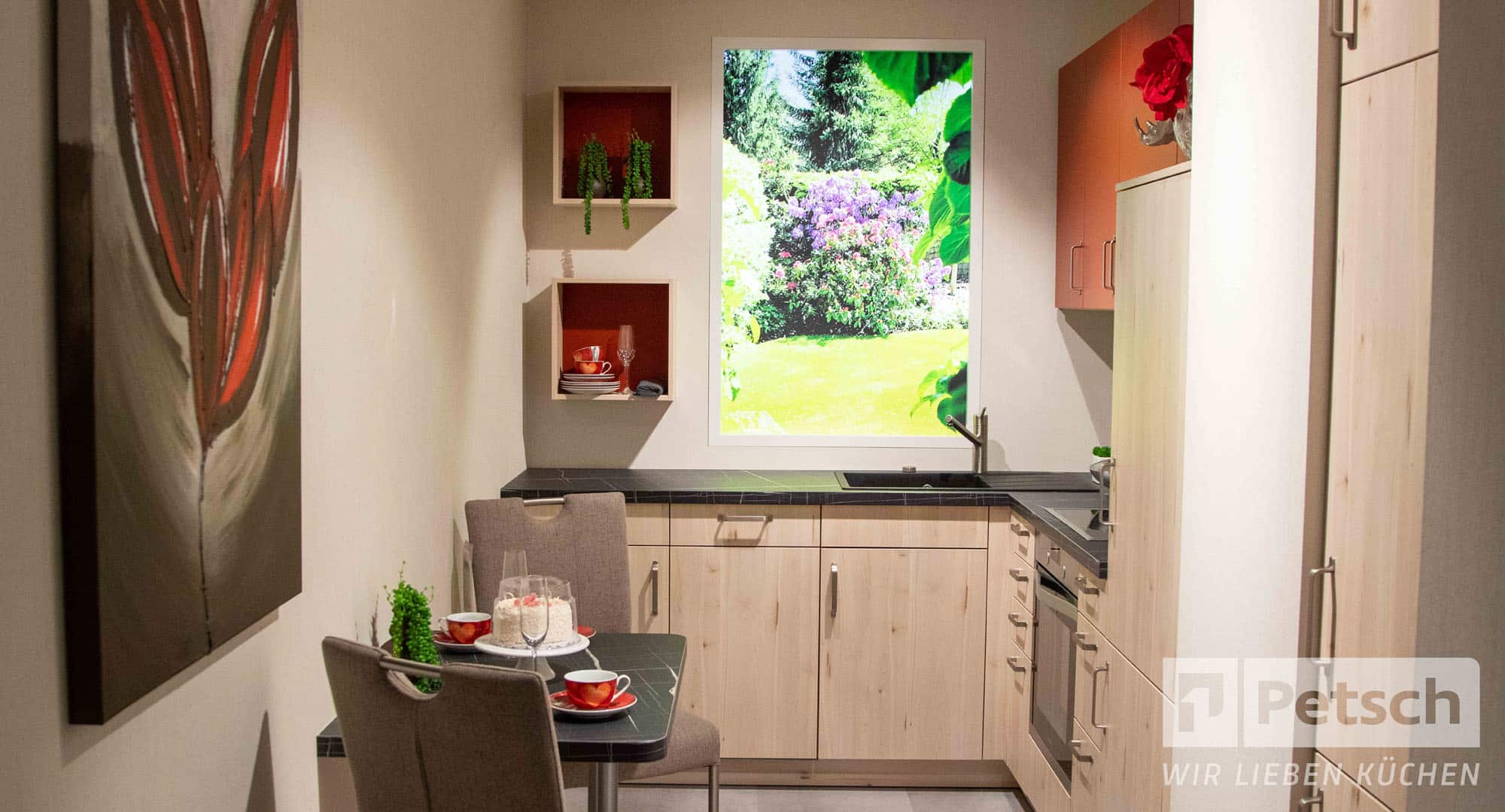 Diese kompakte L-Küche von Schüller erstrahlt in einem wunderbaren Dekor Schiefer sand, welches sämtliche Küchenfronten bekleidet und dazu eine angenehm wohnliche Atmosphäre schafft. Im passenden Kontrast dazu zeigt sich die Arbeitsplatte in einer schwarzen Marmor Optik, die ebenfalls ein entsprechendes Muster aufweist. Selbiges Material und Design finden sich beim kleinen Esstisch, der sich perfekt für…