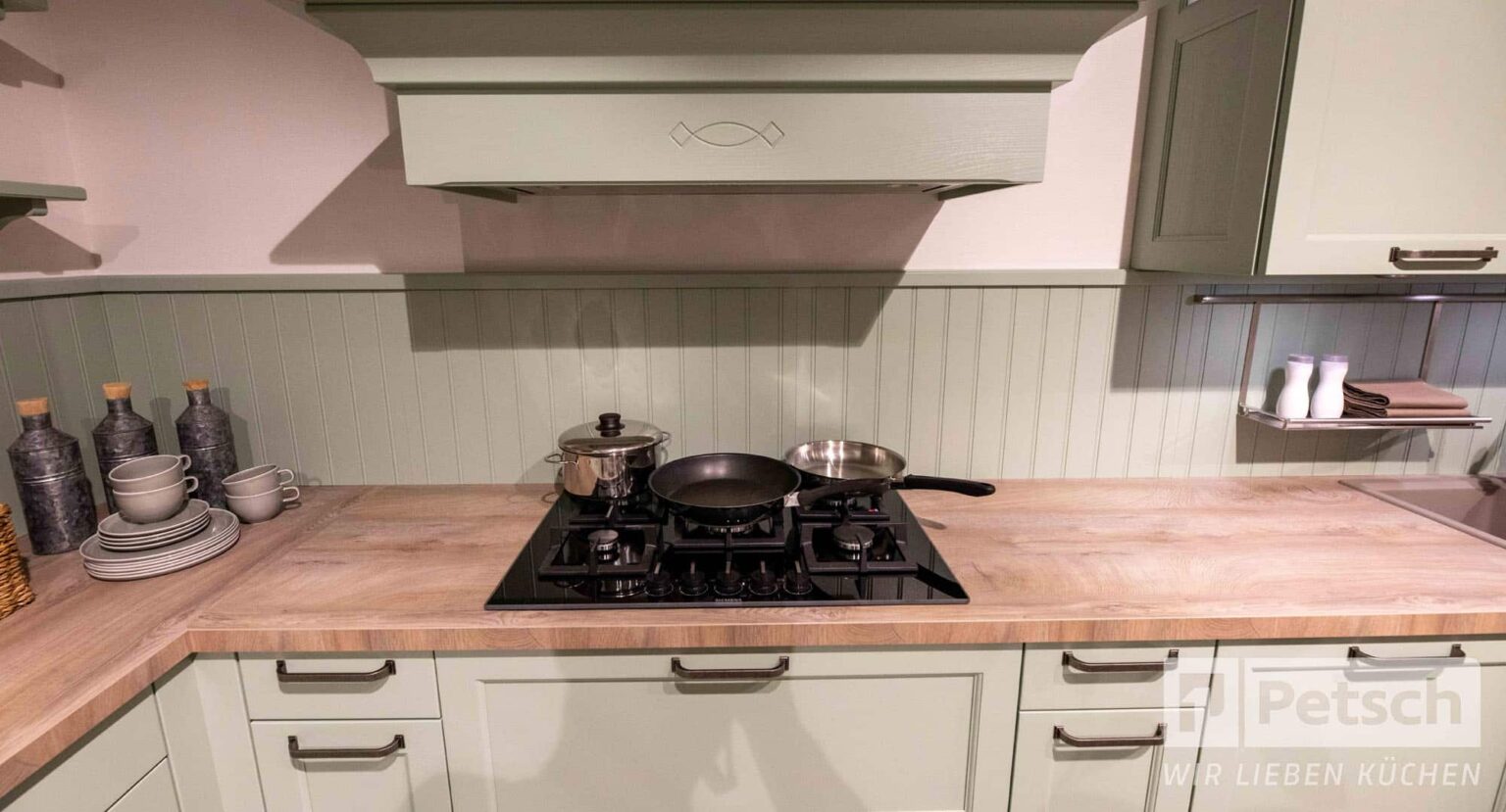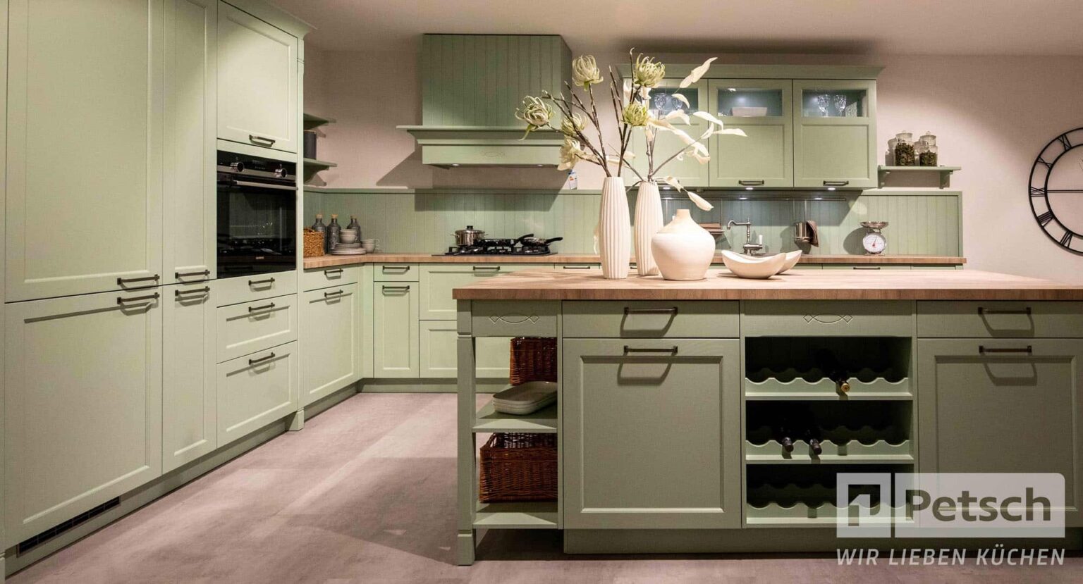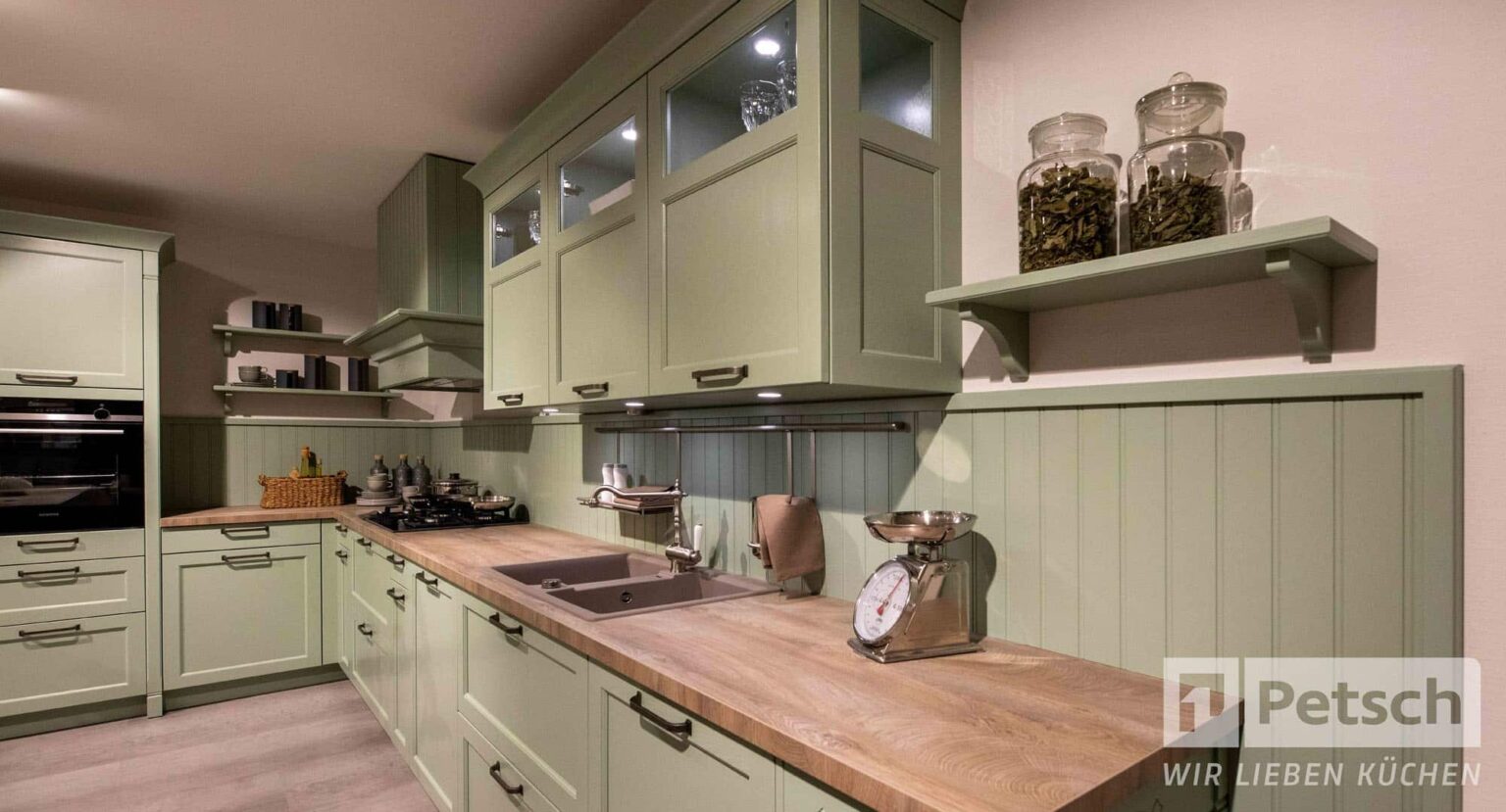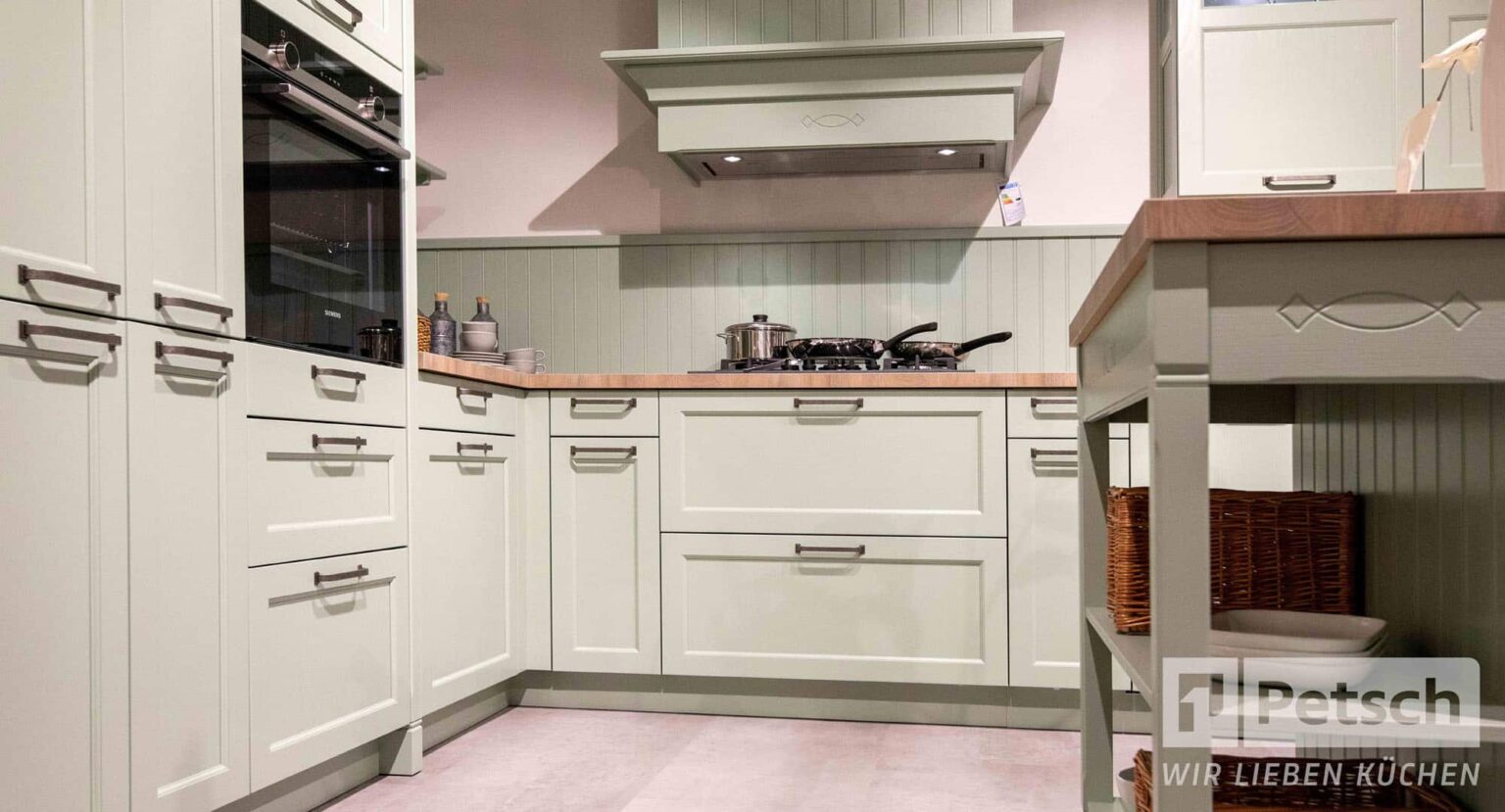 Grün ist voll im Trend, weshalb wir Ihnen unsere pastellgrüne Häcker Landhausküche natürlich nicht vorenthalten können. Grundlegend besteht diese wunderbare Küche aus einem L und einer Kücheninsel, die zusammen ein optimales Küchenerlebnis ergeben: Kurze Arbeitswege, weitreichende Arbeitsflächen und umfangreichste Stauraummöglichkeiten treffen auf modernste E-Geräte - Eine perfekt austarierte Ausstellungsküche eben. Sogenannte Kassettenfronten sorgen zusammen mit…