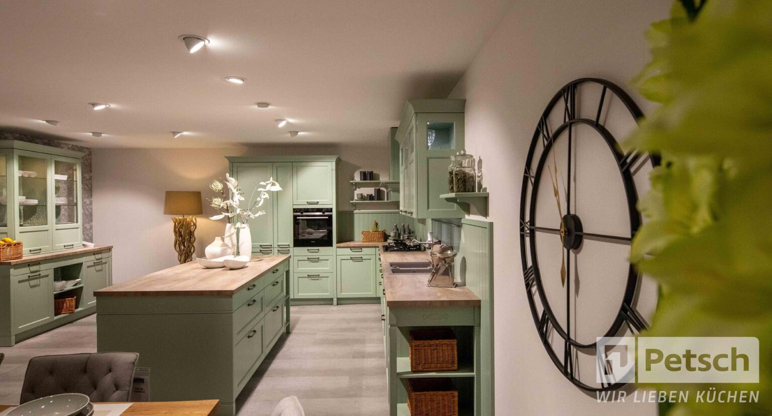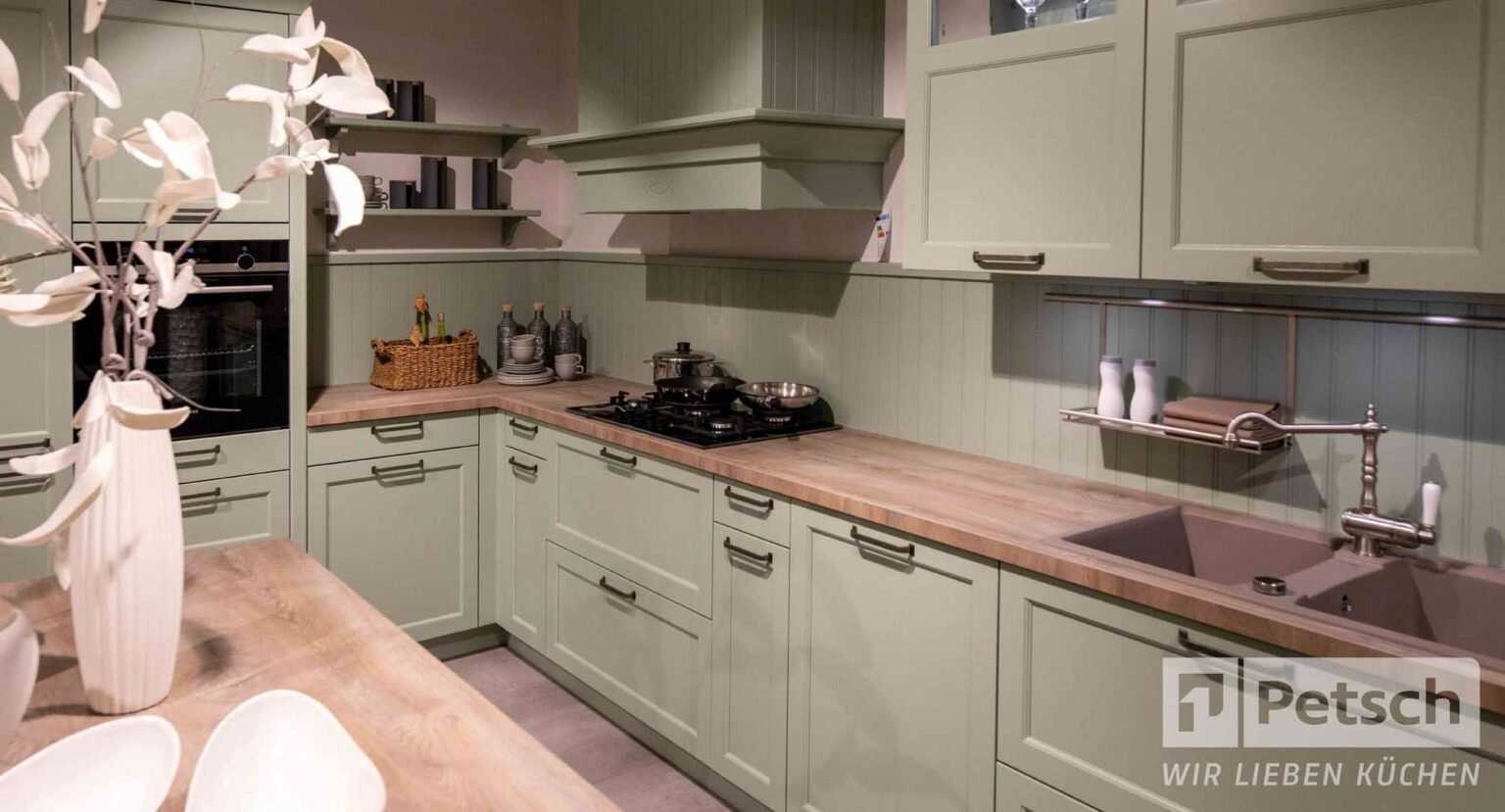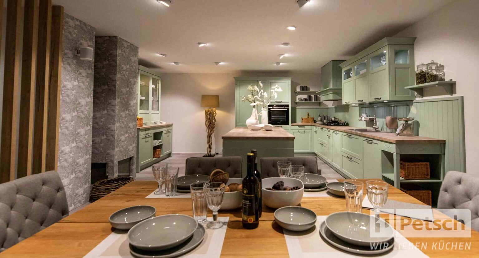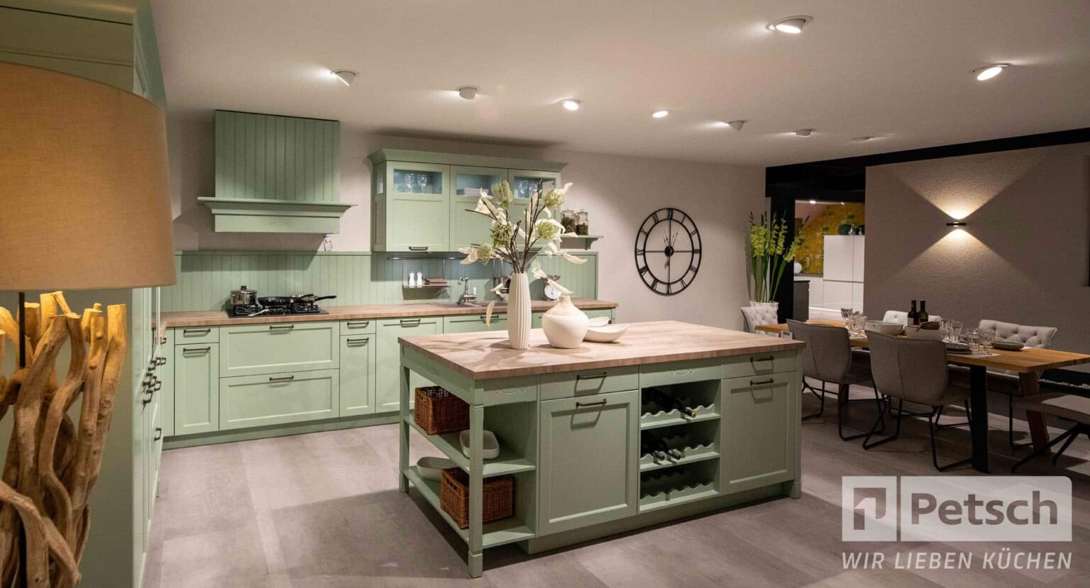 Grün ist voll im Trend, weshalb wir Ihnen unsere pastellgrüne Häcker Landhausküche natürlich nicht vorenthalten können. Grundlegend besteht diese wunderbare Küche aus einem L und einer Kücheninsel, die zusammen ein optimales Küchenerlebnis ergeben: Kurze Arbeitswege, weitreichende Arbeitsflächen und umfangreichste Stauraummöglichkeiten treffen auf modernste E-Geräte - Eine perfekt austarierte Ausstellungsküche eben. Sogenannte Kassettenfronten sorgen zusammen mit…