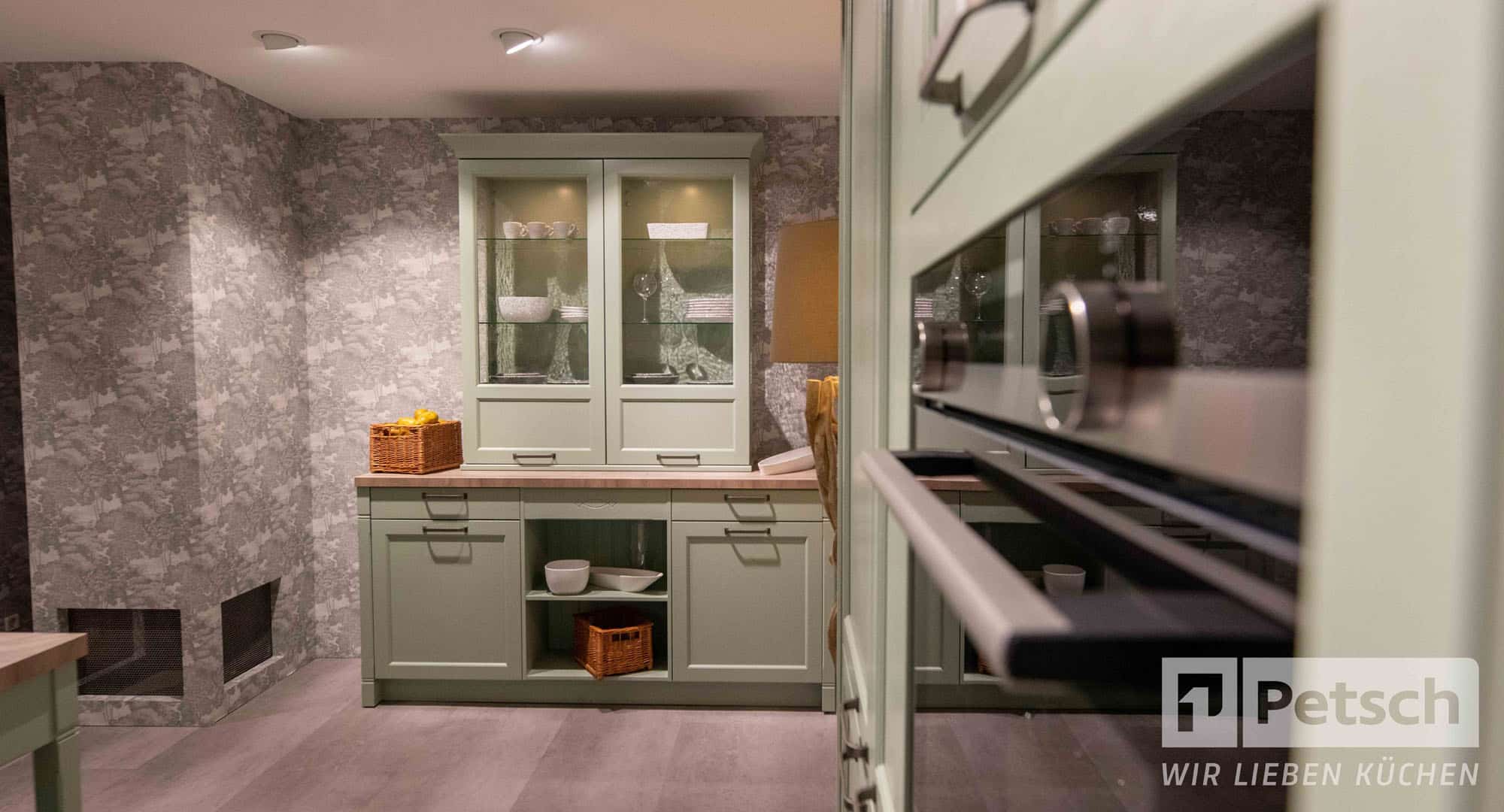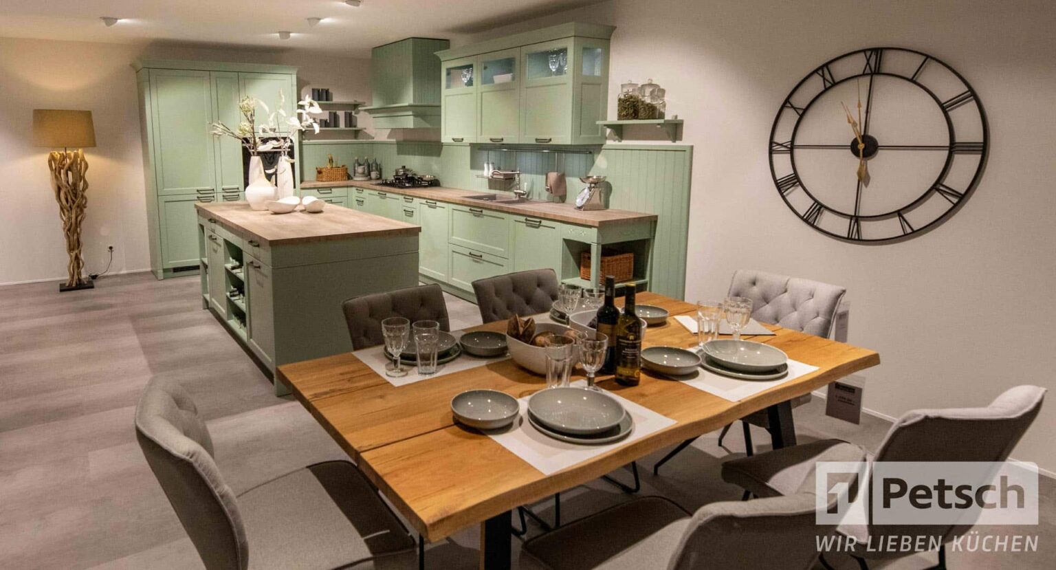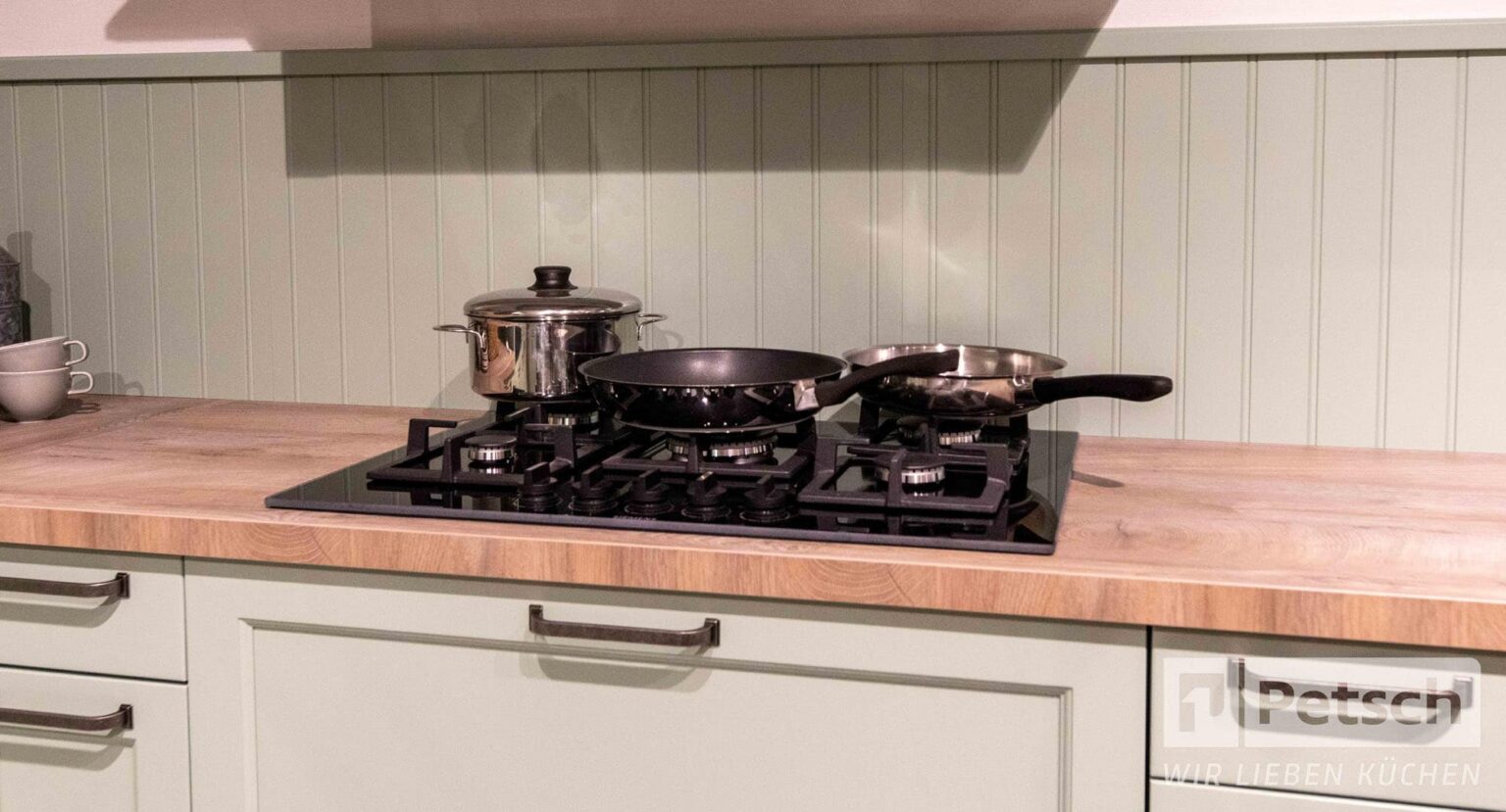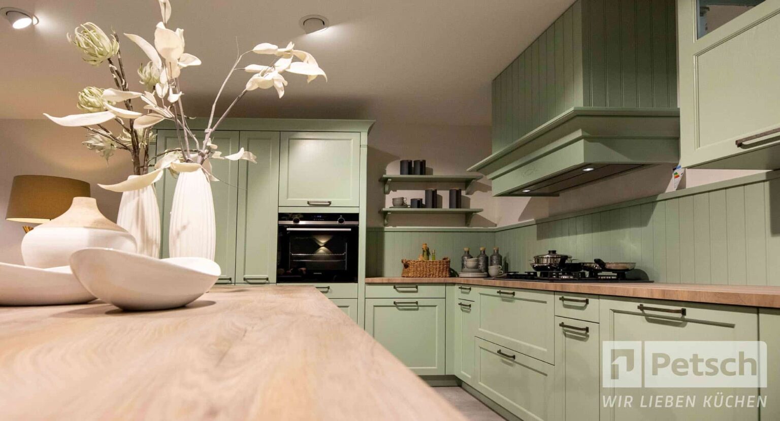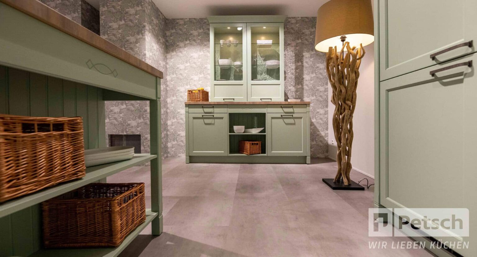 Grün ist voll im Trend, weshalb wir Ihnen unsere pastellgrüne Häcker Landhausküche natürlich nicht vorenthalten können. Grundlegend besteht diese wunderbare Küche aus einem L und einer Kücheninsel, die zusammen ein optimales Küchenerlebnis ergeben: Kurze Arbeitswege, weitreichende Arbeitsflächen und umfangreichste Stauraummöglichkeiten treffen auf modernste E-Geräte - Eine perfekt austarierte Ausstellungsküche eben. Sogenannte Kassettenfronten sorgen zusammen mit…