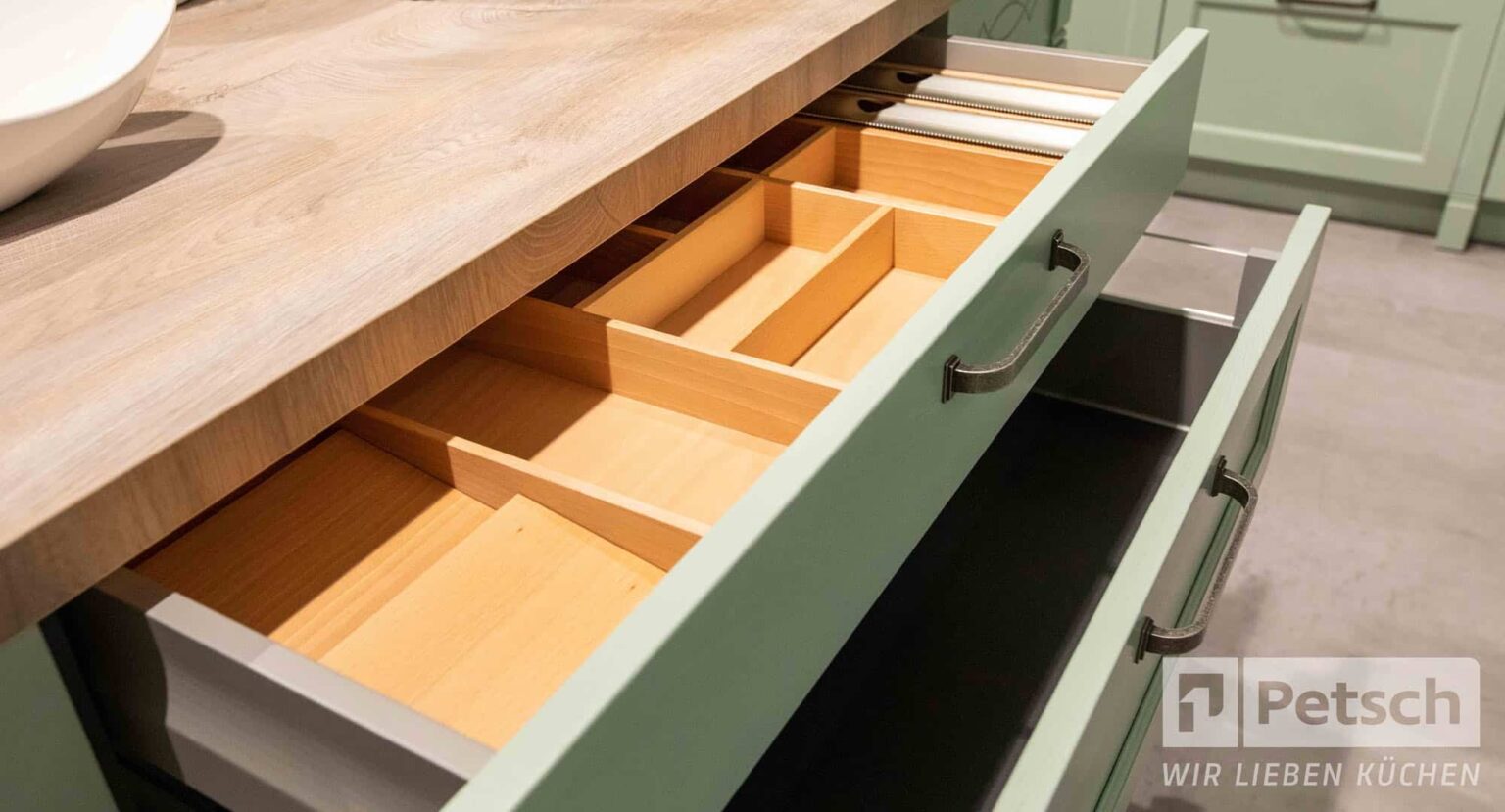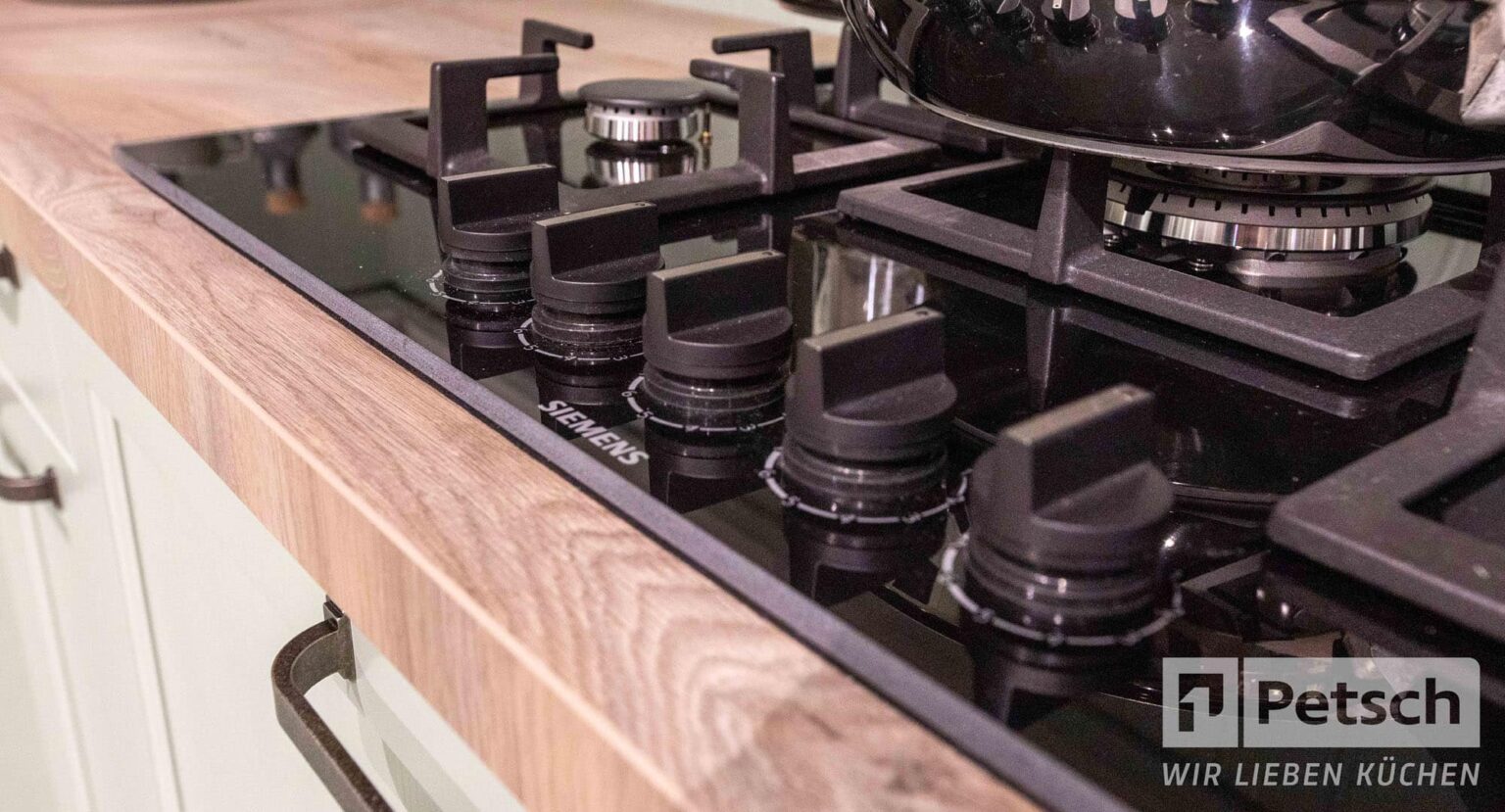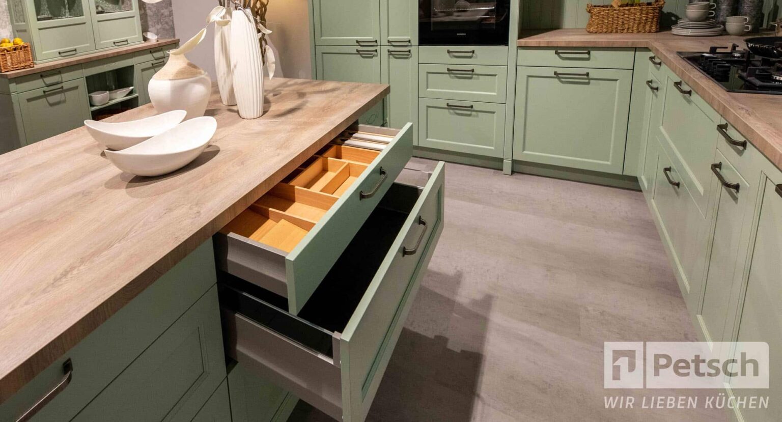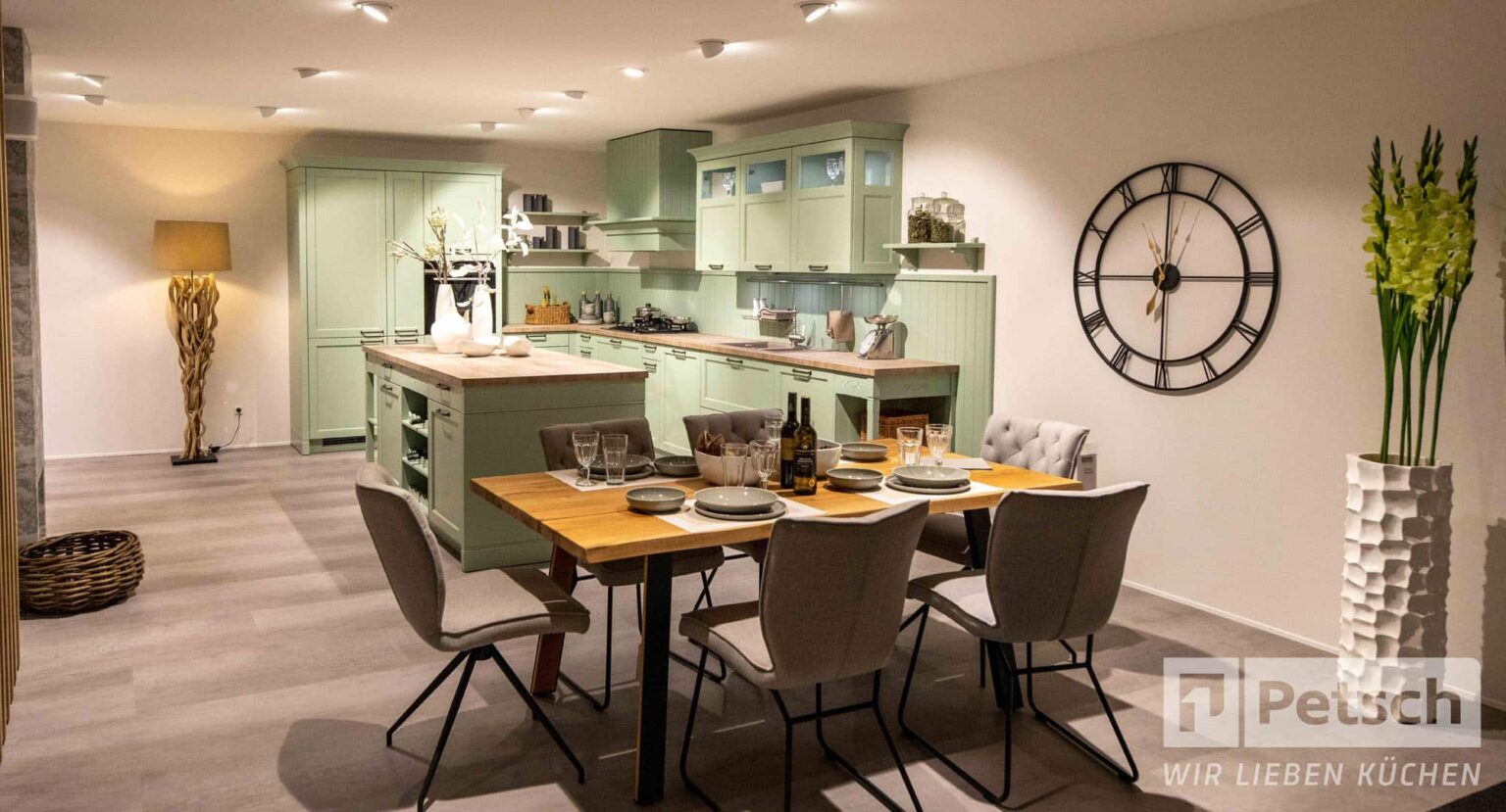 Grün ist voll im Trend, weshalb wir Ihnen unsere pastellgrüne Häcker Landhausküche natürlich nicht vorenthalten können. Grundlegend besteht diese wunderbare Küche aus einem L und einer Kücheninsel, die zusammen ein optimales Küchenerlebnis ergeben: Kurze Arbeitswege, weitreichende Arbeitsflächen und umfangreichste Stauraummöglichkeiten treffen auf modernste E-Geräte - Eine perfekt austarierte Ausstellungsküche eben. Sogenannte Kassettenfronten sorgen zusammen mit…