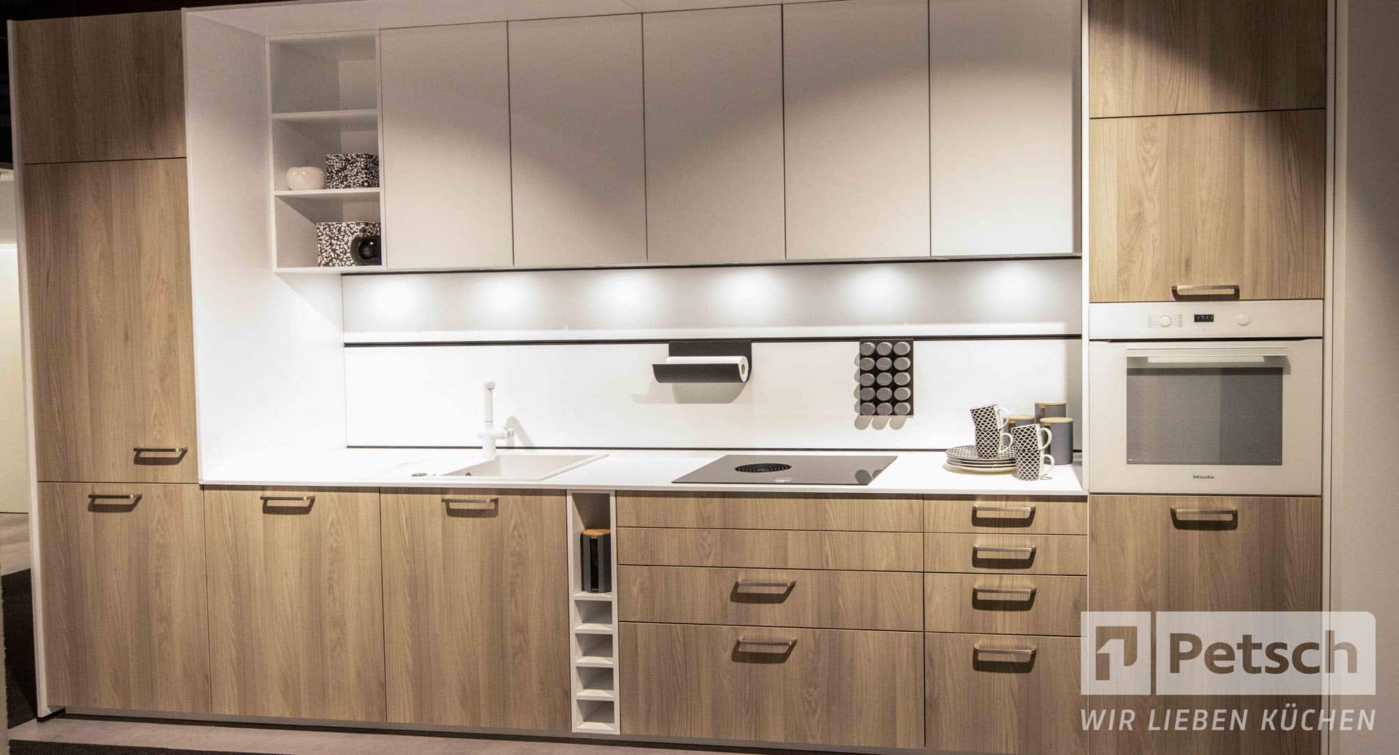 Küchenzeilen sind langweilig? Eine Küchenzeile bietet nicht genug Stauraum? Bei einer Küchenzeile muss ich auf Dinge verzichten? Diese Küchenzeile von Schüller Küchen beweist klar das Gegenteil. Optisch ansprechende Küchenfronten aus einer Holznachbildung im Eschen-Design schmücken das Außenleben dieser wunderbar kleinen aber doch irgendwie großen Küche. Die kristallweiße Arbeitsplatte kommt wunderbar daher und bietet zusammen mit…
