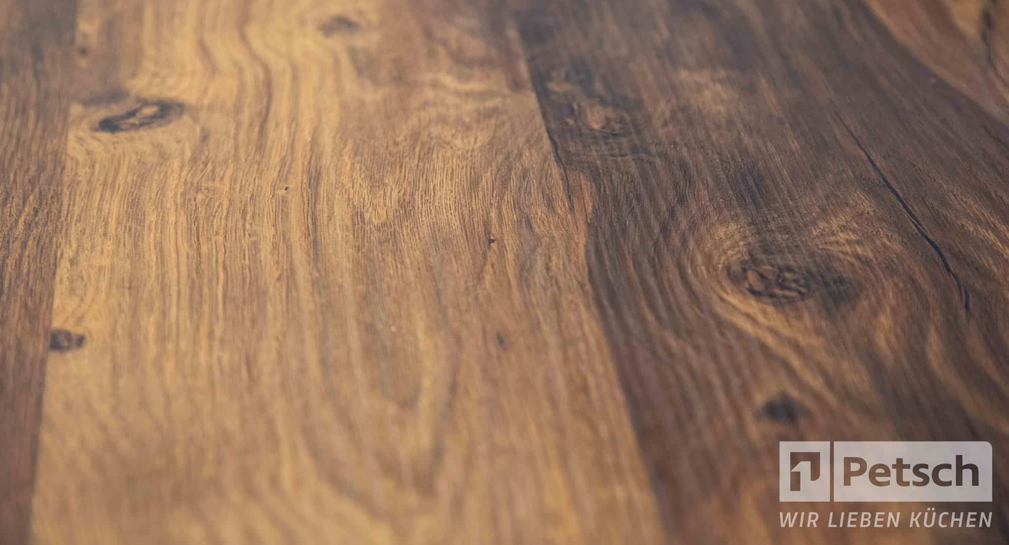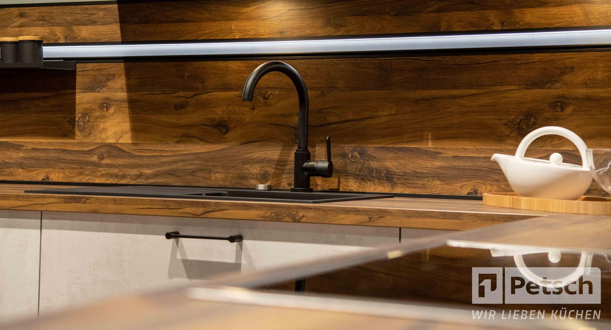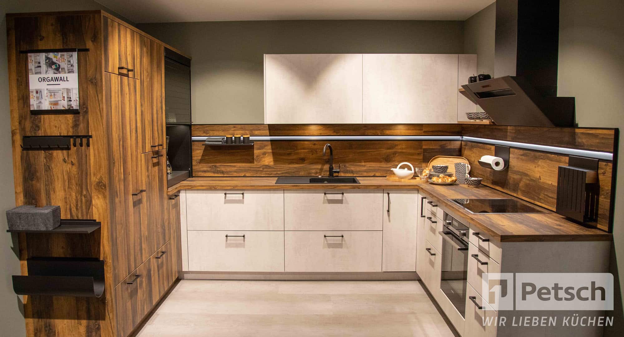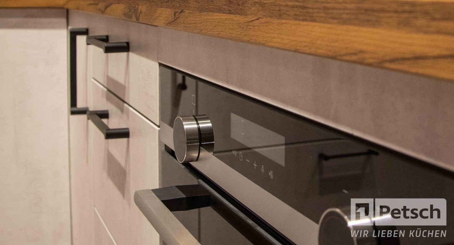 Diese Schüller U-Küche ist ein Sinnbild von Zurückhaltung und Modernität, die sich Hand in Hand zu einem wohnlichen Gesamtbild zusammenfügen. Die betongrauen Küchenfronten strahlen eine gewisse Kälte aus, die durch den massiven Einsatz der Chaleteiche Fronten, Rückwand und Arbeitsplatte den perfekten Einklang finden, welche ein heimeliges Gefühl entstehen lassen. Die Oberschränke sind im selben Beton…