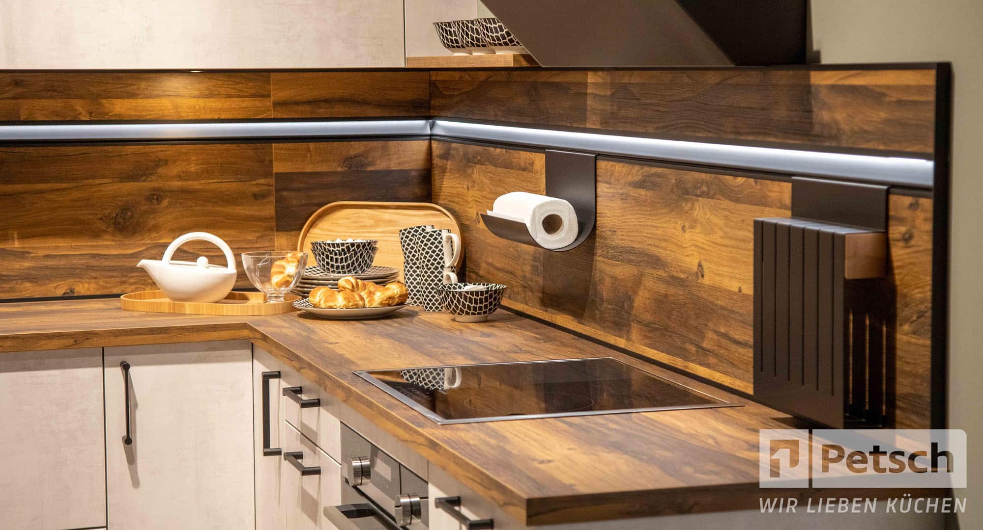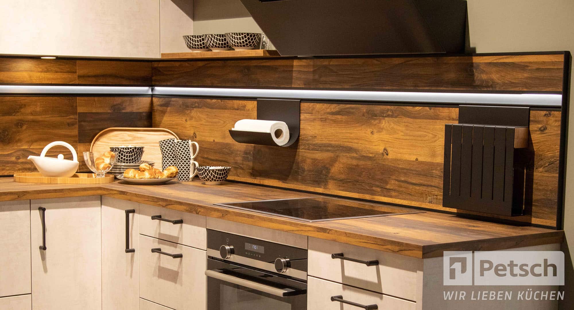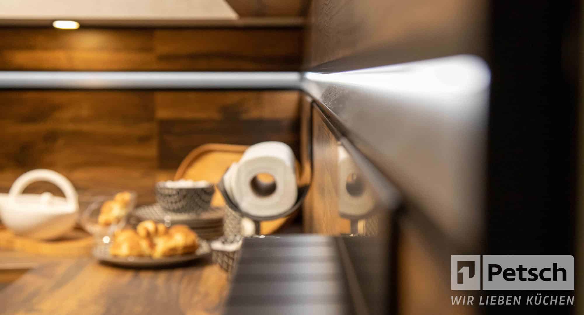 Wandpaneel für Paneelsystem – Immer an der Wand entlang – so integriert sich das Wandpaneel bestens in die Küche. Die Paneelprofile gibt es in Edelstahlfarben oder elegant in Onyxschwarz. Die Rückwände sind in verschiedenen Materialien erhältlich. Als Ergänzung sind diverse Funktionselemente für das Paneelsystem erhältlich. Ob Haken für Kochutensilien, das Ablageregal für feine Gewürze und Öle oder der Messerblock zum Hängen – das Paneelsystem unterstützt Sie optimal bei den Arbeitsabläufen in Ihrer Küche – perfekt platziert und funktional.