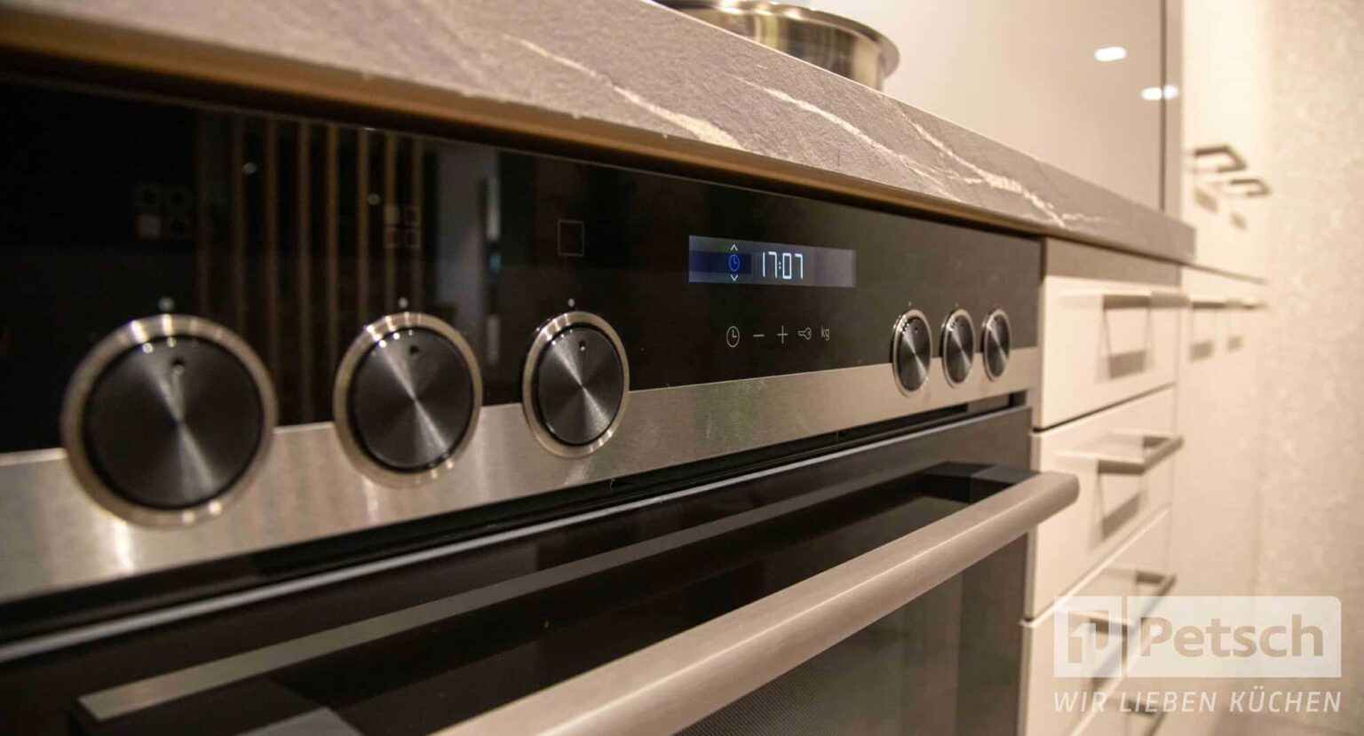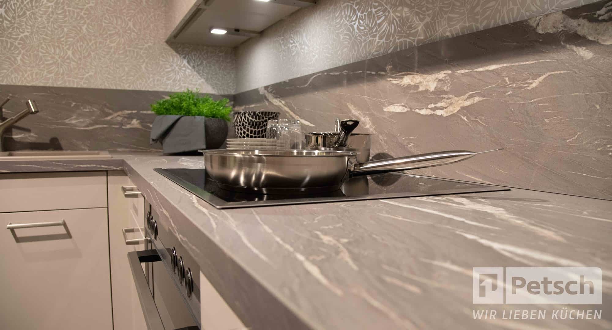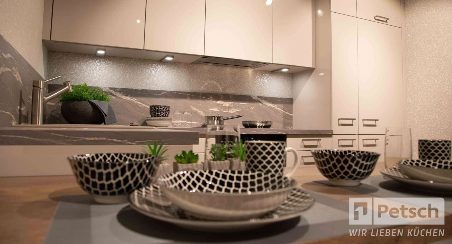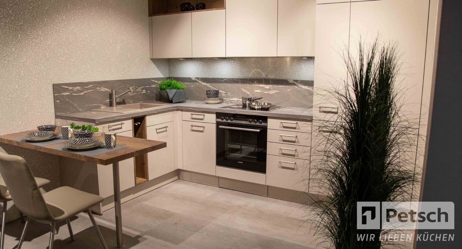 Ob als Singleküche oder für einen Zwei-Personen-Haushalt: Unsere Schüller L-Küche ist perfekt geeignet für viele Situationen und besticht dabei durch eine besondere Kombination aus Modernität und Eleganz. Bei den Küchenfronten handelt es sich um sandfarbene hochglanz Lackfronten, die Hochwertigkeit und Seriosität ausstrahlen. Ein gewollter „Stilbruch" wird durch die besondere Arbeitsplatte in Marmoroptik (Terra) Griffe in…