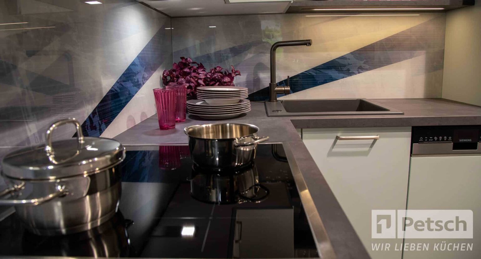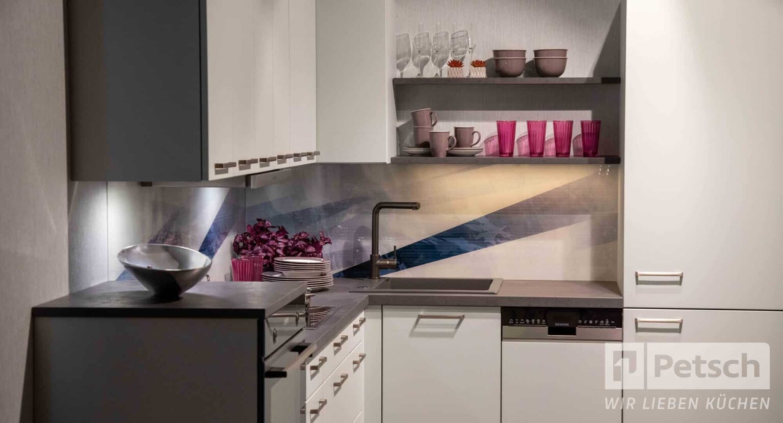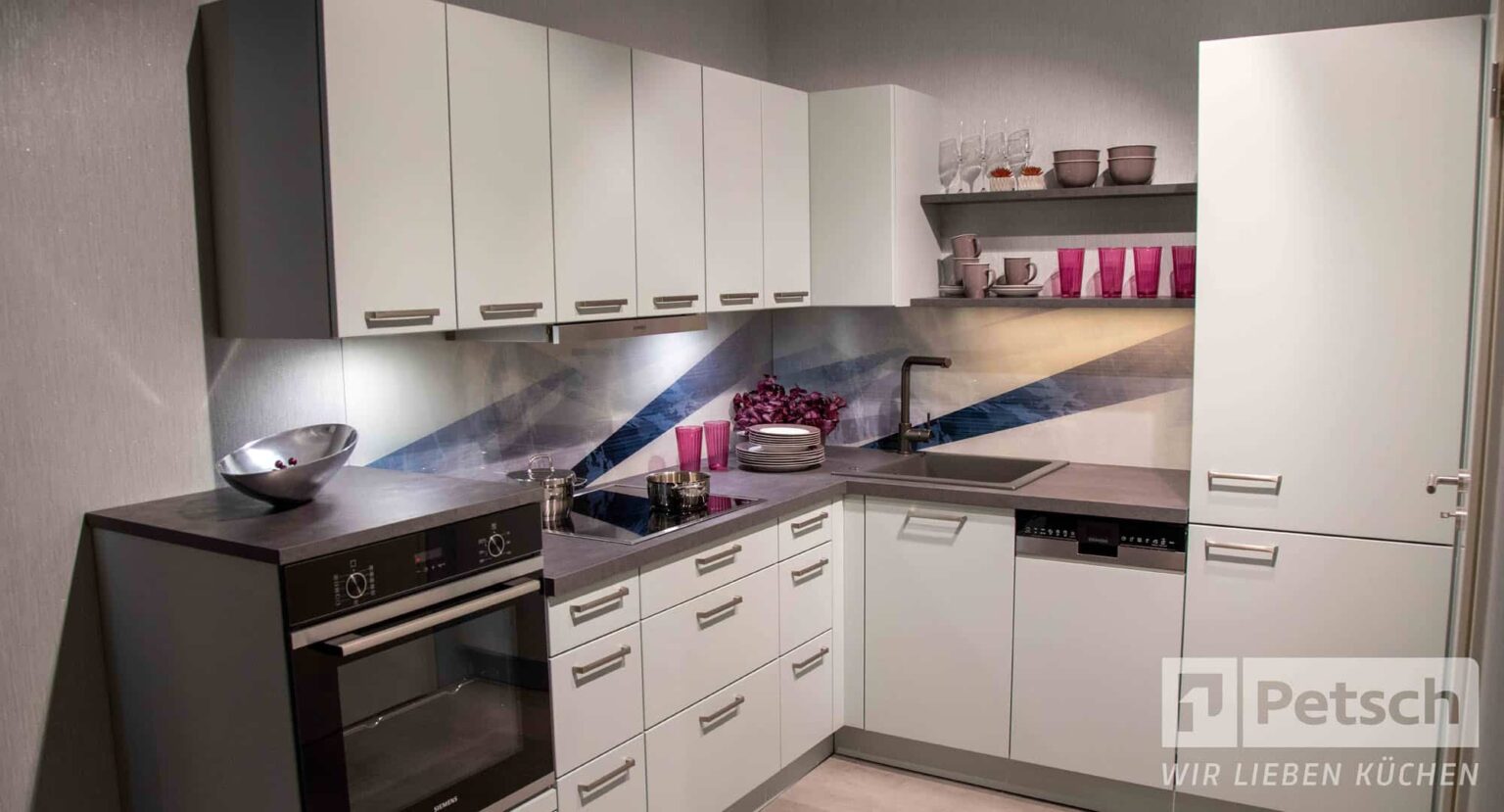 Diese kleine aber feine Ausstellungsküche in L-Form bietet alles und noch viel mehr und zwar auf kleinstem Raum. Kochfeld und Spüle sind so integriert das in den Zwischenräume eine optimale Arbeitsfläche zur Verfügung steht, um sich kreativ auszuleben. Gleichzeitig ist genug Platz eingeplant worden für einen Kühlschrank, Geschirrspüler und einen Backofen. Letzterer befindet sich sogar…