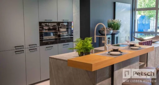 Die Marmor-Keramik wirkt edel und ist im Alltag extrem robust – hitze- und schnittfest, leicht zu reinigen. Die Barplatte in Eiche macht die Insel zum Lieblingsplatz. Mit BORA Pro kochst du frei von Dunst direkt auf der Insel, Miele liefert Komfort von Dampf- bis AutoDos-Spülen. Viel Design, viel Fläche, viel Technik – in einer stimmigen, zeitlosen Komposition.