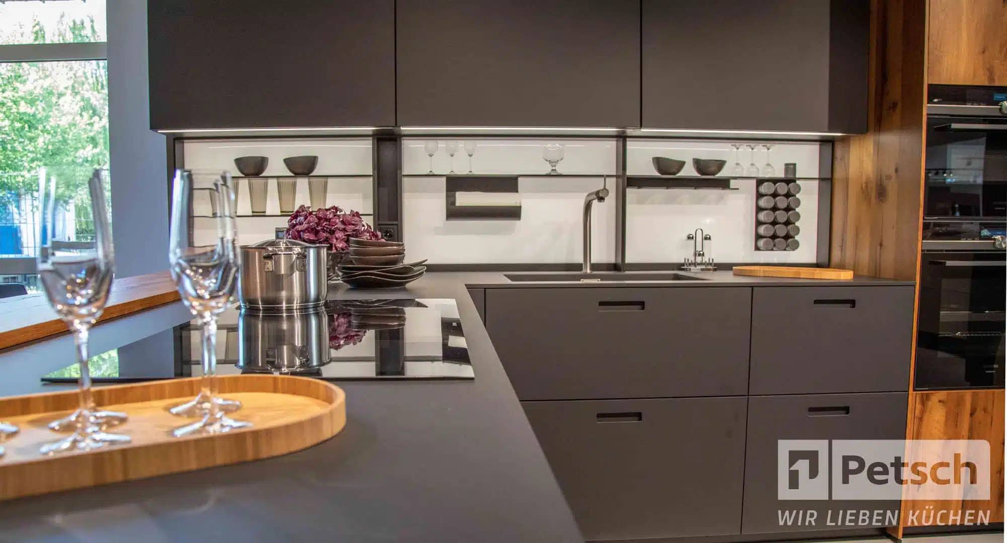 Kompakt, elegant, alltagstauglich: Die L-Küche verbindet tiefes Onyxschwarz mit warmem Alteiche-Furnier zu einem ruhigen, hochwertigen Look. Die feinmatte Systemo-Arbeitsplatte bietet eine samtige Haptik und ist besonders pflegeleicht. Offene FRAME-Regale mit Beleuchtung setzen Gläser und Gewürze in Szene; die integrierte Tresenplattelädt zum schnellen Frühstück oder zum Glas Wein am Abend ein. Griffschalen in Onyxschwarz halten die Linien klar und grifflos.