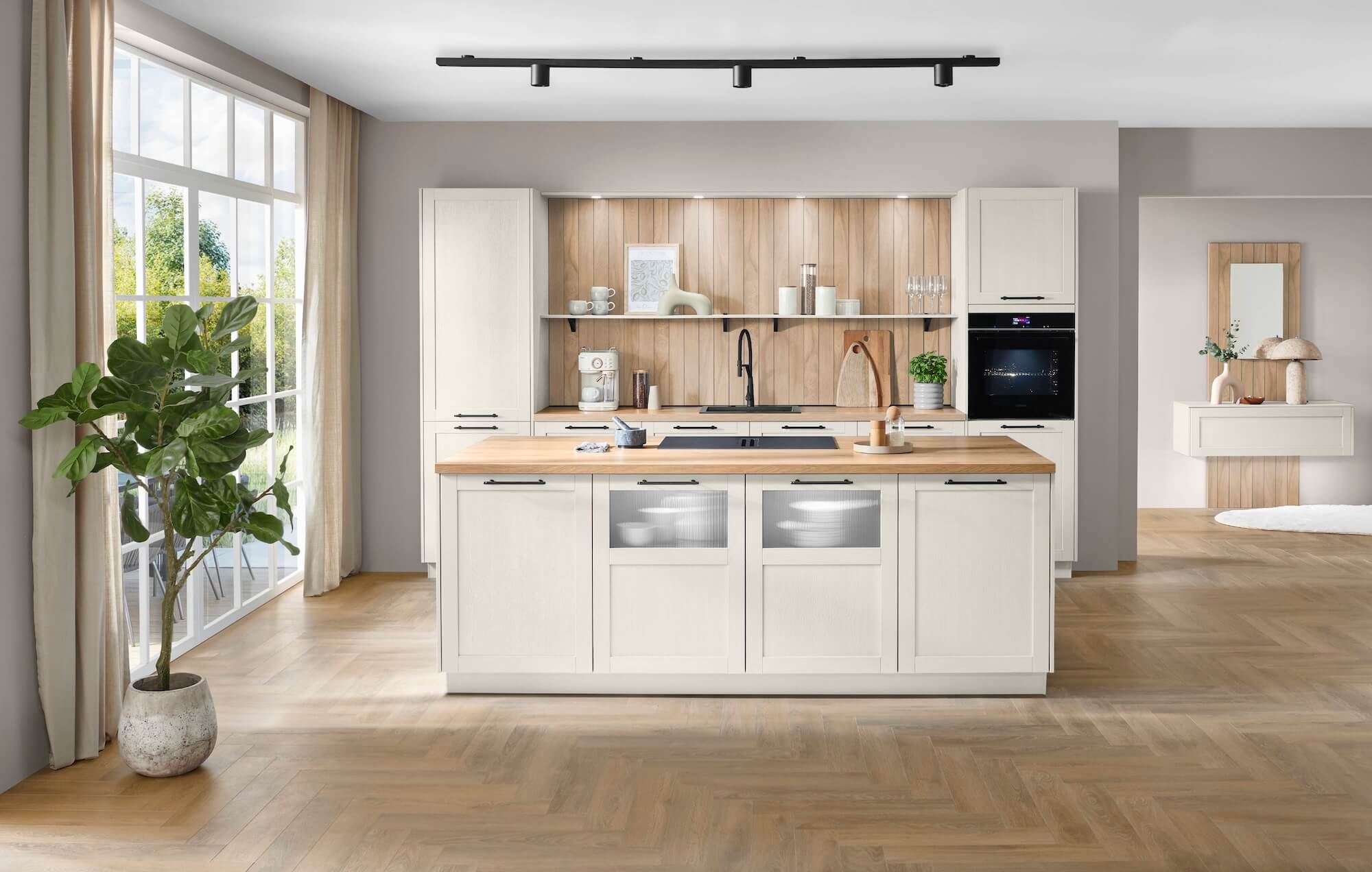 Die Nobilia Landhausküche Magnolia mit Insel vereint den traditionellen Charme des Landhausstils mit der Klarheit moderner Küchenplanung. Helle Magnolia-Fronten, warme Holzdekore und eine offene Raumgestaltung schaffen eine wohnliche Atmosphäre, die Leichtigkeit und Behaglichkeit ausstrahlt.