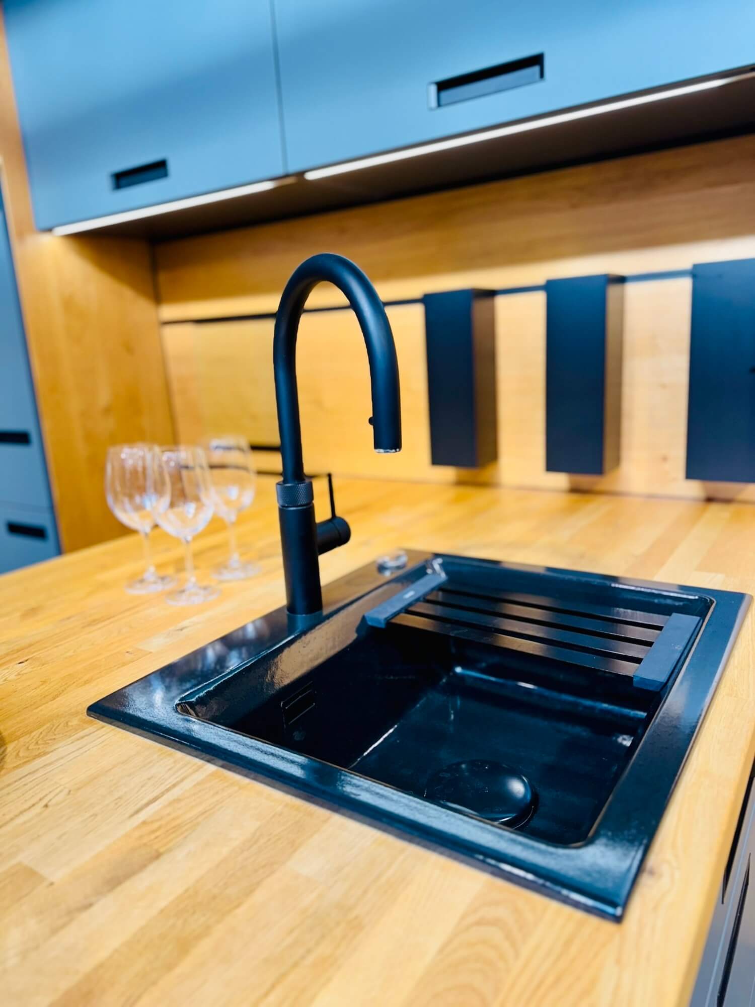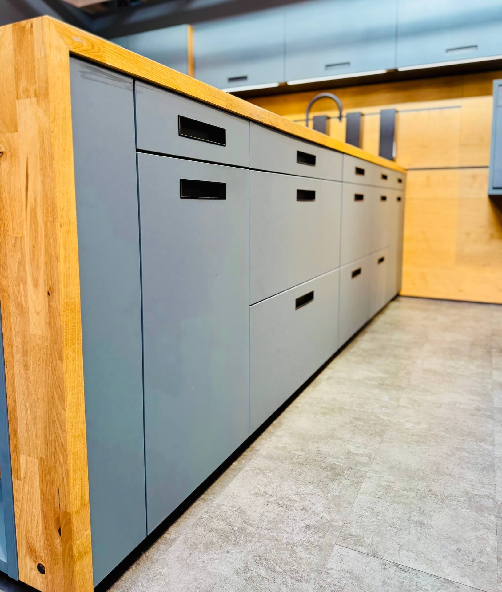 Die samtmatte Oberfläche besticht durch ihre angenehme Haptik und das elegante Lichtspiel. Fingerabdrücke oder störende Spiegelungen gibt es dann Anti-Fingerprint-Beschichtung nicht.. Diese Fronten wirken dezent, edel und bleiben dabei pflegeleicht. Die großzügig gestaltete Insel bildet das Herzstück der Küche. Sie bietet viel Arbeitsfläche und Stauraum, während die klare Linienführung für eine aufgeräumte, moderne Ästhetik sorgt.