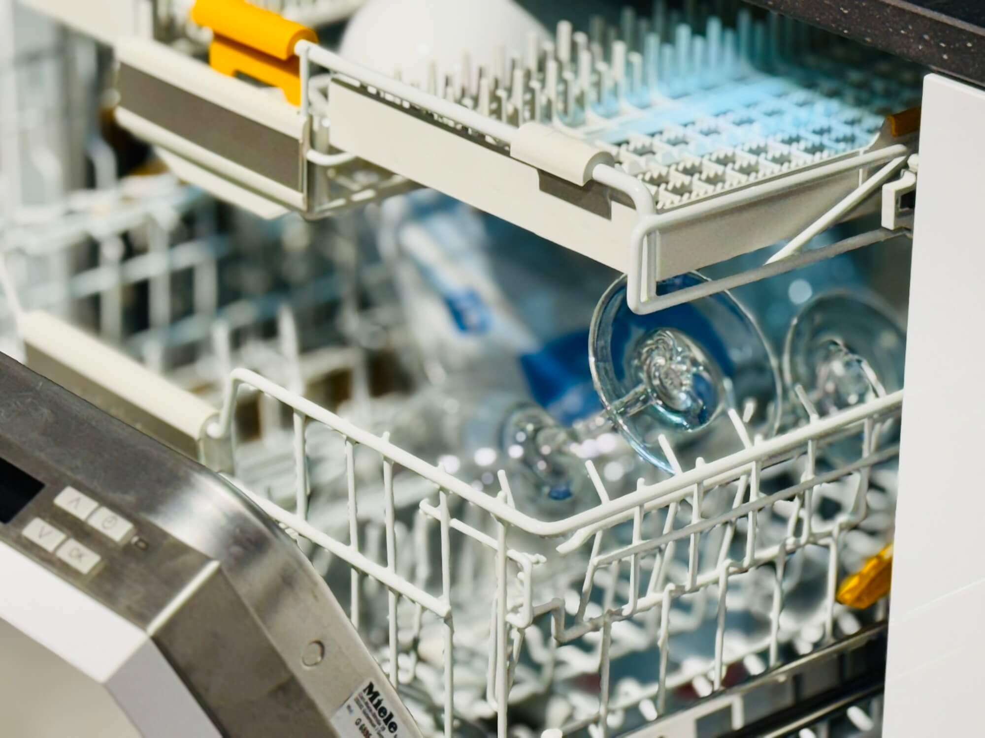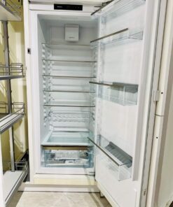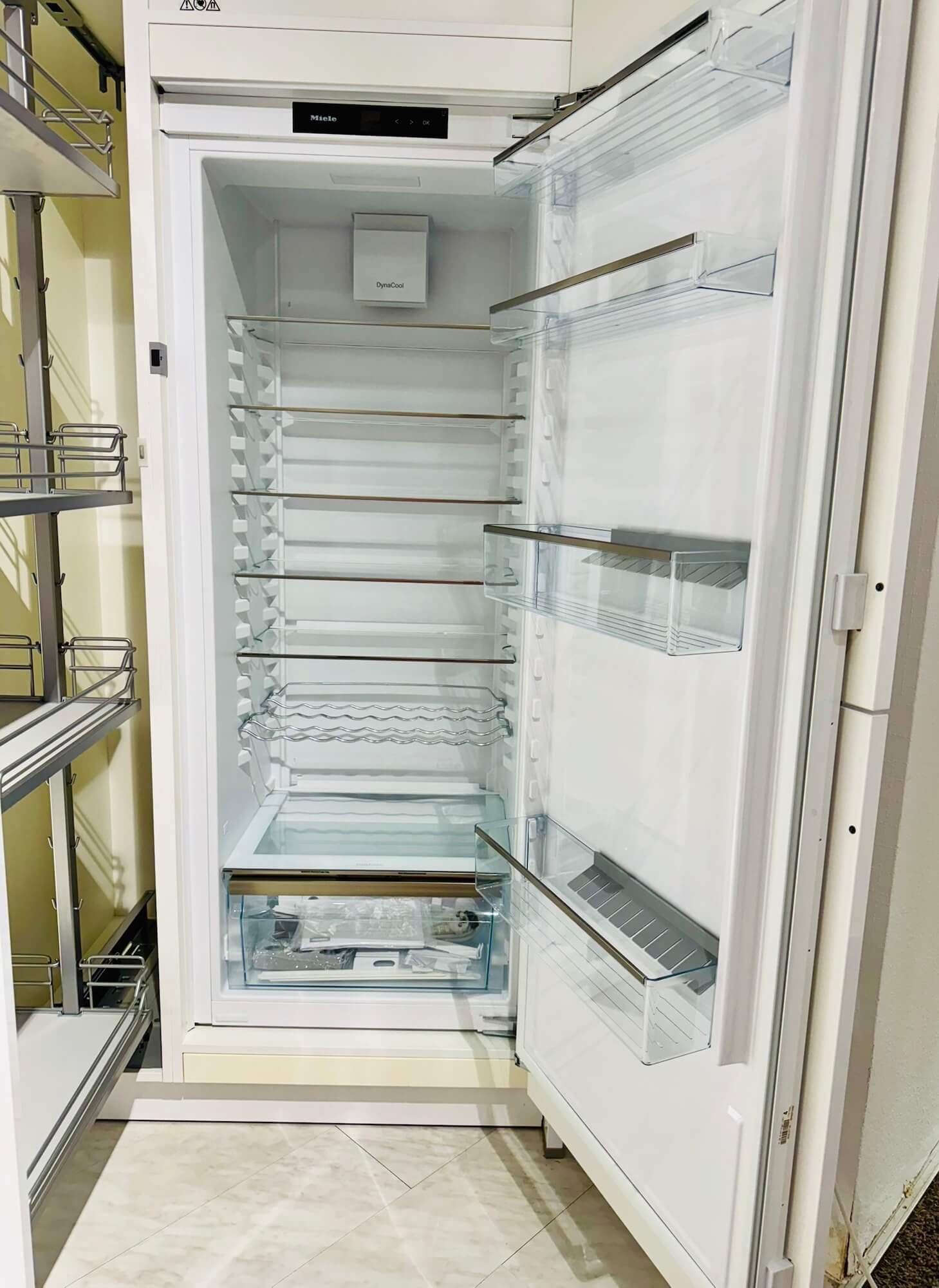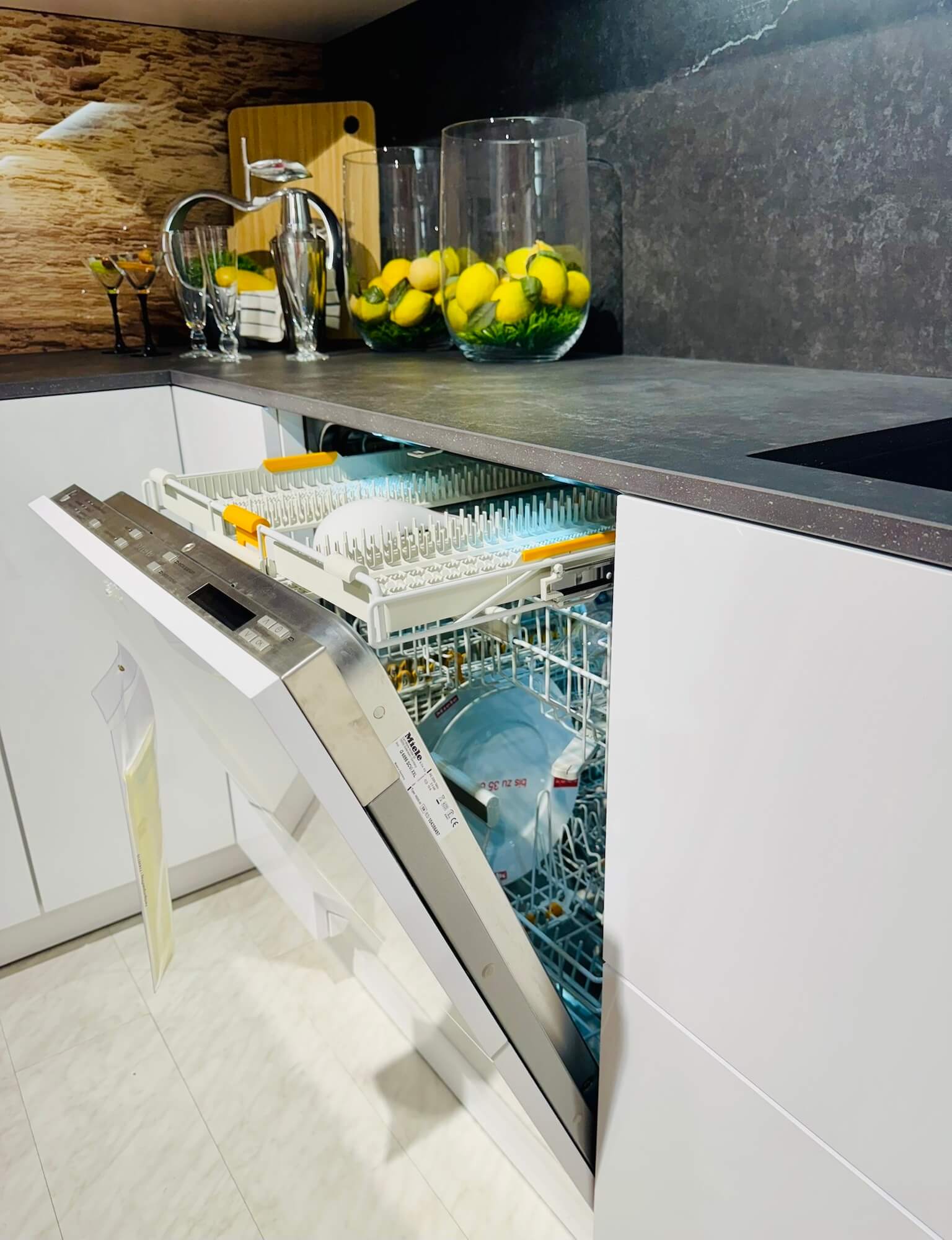 Die Küche ist mit hochwertigen Einbaugeräten ausgestattet, die sowohl funktional als auch ästhetisch überzeugen. Die Miele Wandesse DA 6086 W White Wing (Energieeffizienzklasse B) saugt die Kochdünste effizient ab und fügt sich harmonisch in das Design der Küche ein. Der Miele Geschirrspüler vollintegriert G 6895 SCVi XXL (Energieeffizienzklasse alt A+++(-20%) (A+++ bis D) ) bietet großzügigen Platz für Ihr Geschirr und arbeitet dabei besonders leise. Der Miele Backofen H 7464 BPX Brillantweiß ( Energieeffizienzklasse A+) ermöglicht präzises Backen und Braten und ergänzt das hochwertige Erscheinungsbild der Küche. Und der Miele Einbaukühlschrank K 7433 E (Energieeffizienzklasse E) bietet schließlich ausreichend Stauraum für Ihre Lebensmittel und fügt sich nahtlos in das Gesamtbild der Küche ein.