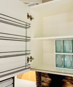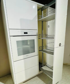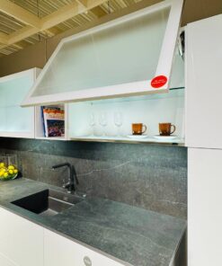 Die Küche zeichnet sich durch ihre klare Linienführung und die Verwendung edelster Materialien aus. Die Fronten in Kristallweiß Hochglanz verleihen der Küche ein modernes und zugleich zeitloses Erscheinungsbild. Die Arbeitsplatte, Nische und Wangen sind aus Dekton, einem Material, das für seine Widerstandsfähigkeit und Pflegeleichtigkeit bekannt ist.