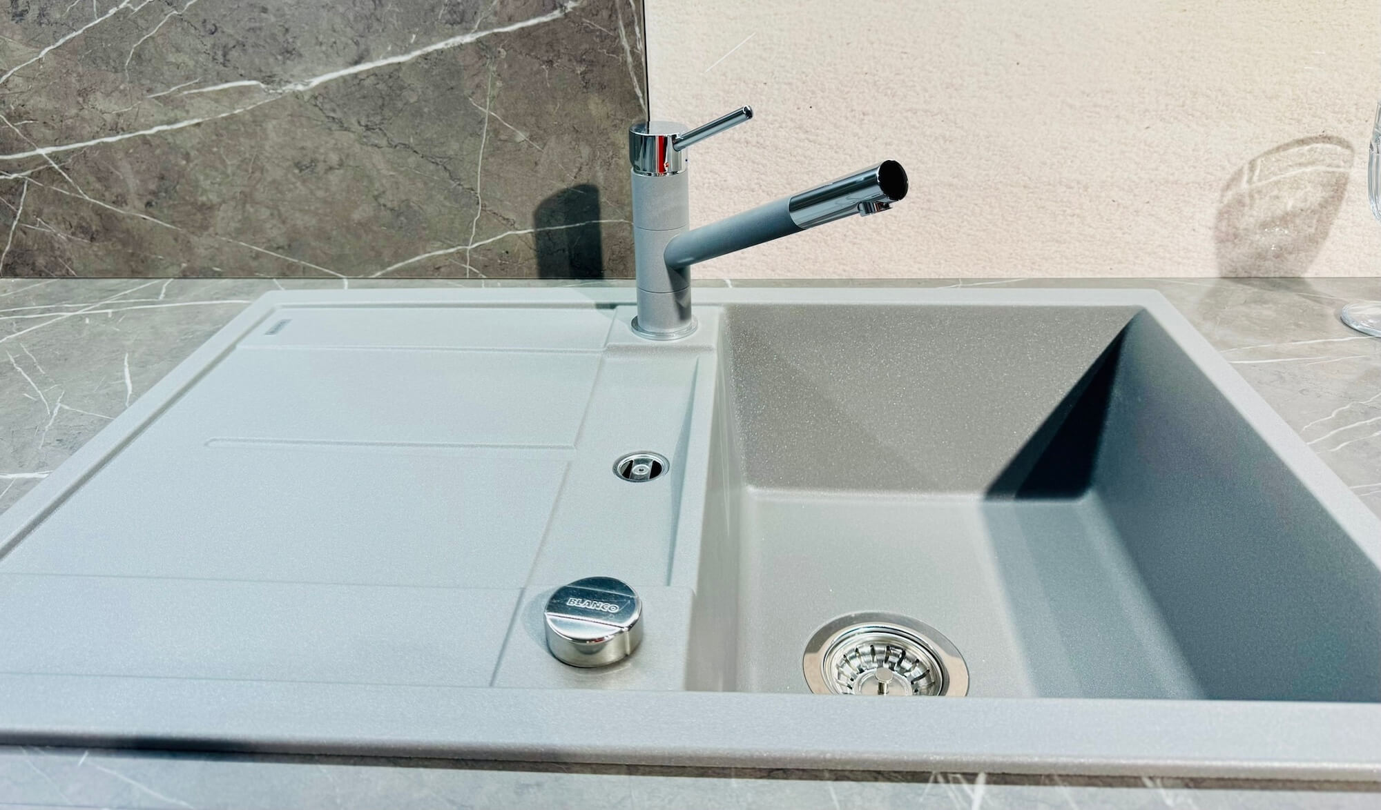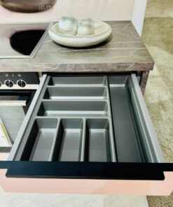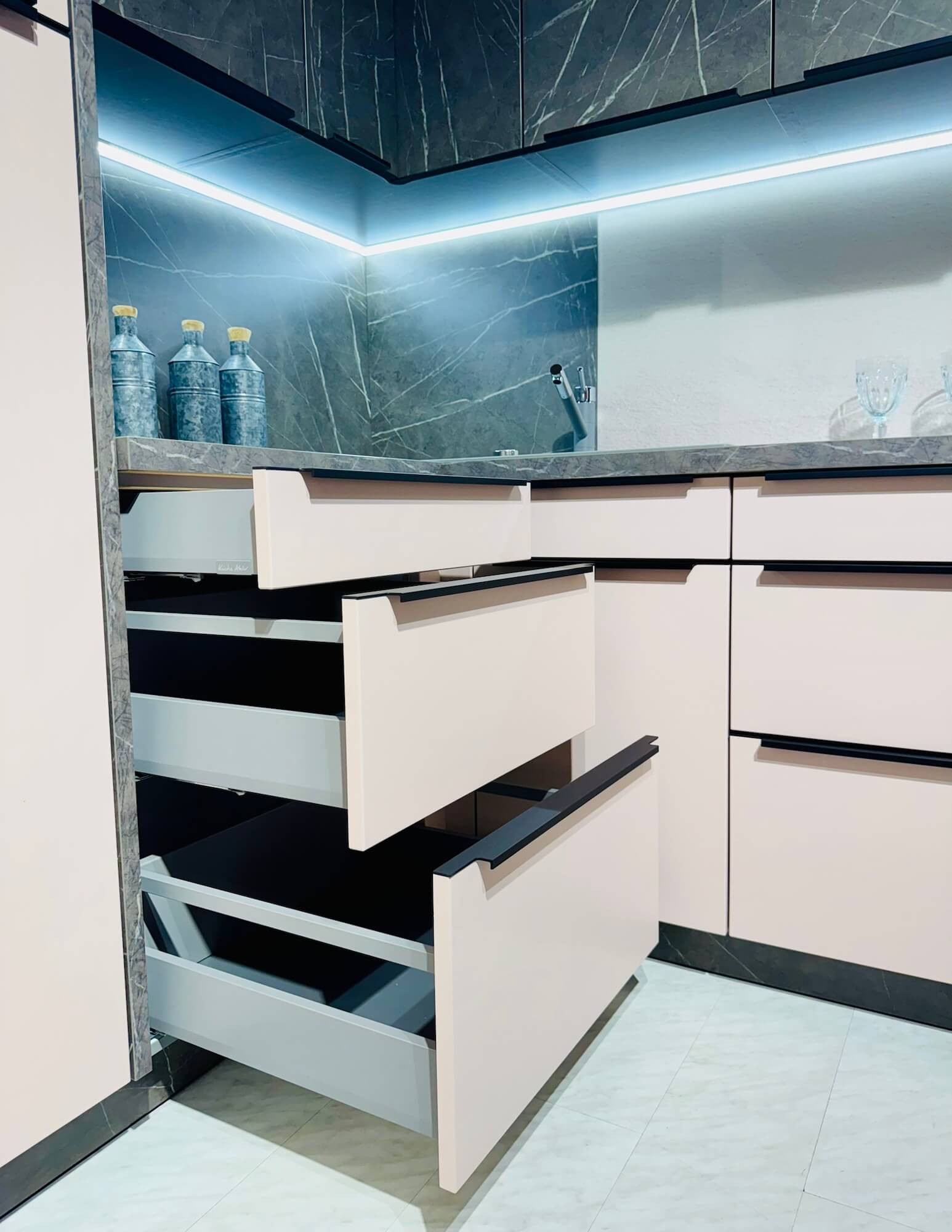 Mit der Schüller Moderne L-Küche Pastellrose Satin holen Sie sich eine Küche ins Haus, die modernes Design und raffinierte Funktionalität auf elegante Weise vereint. Die samtig-matte Front in zartem Pastellrose verleiht dem Raum eine angenehme Leichtigkeit und schafft eine harmonische Atmosphäre, die sowohl stilvoll als auch wohnlich wirkt. Akzente setzt die Kombination aus Arbeitsplatte, Rückwand und Oberschränken in Marmor Scuro Nachbildung, die einen spannenden Kontrast zur sanften Farbgebung der Fronten bildet und den modernen Charakter der Küche unterstreicht. Diese Ausstellungsküche ist bei Petsch’s Küche aktiv in makellosem Zustand zu sehen.