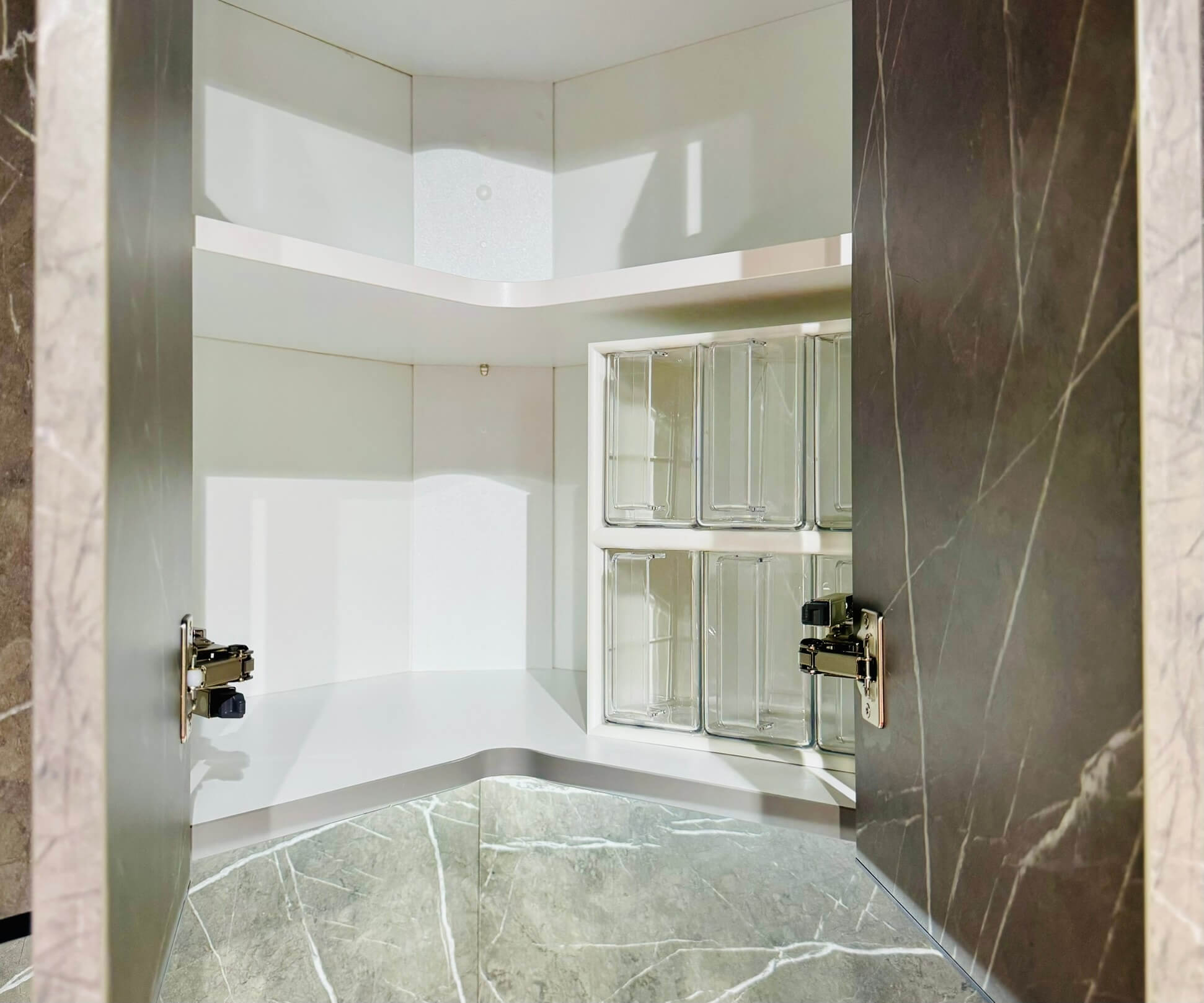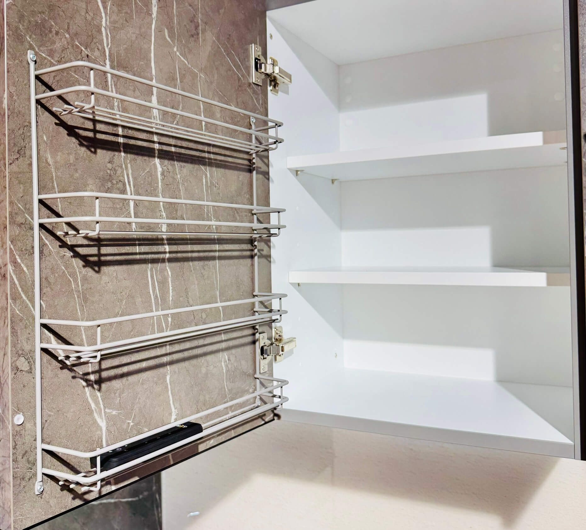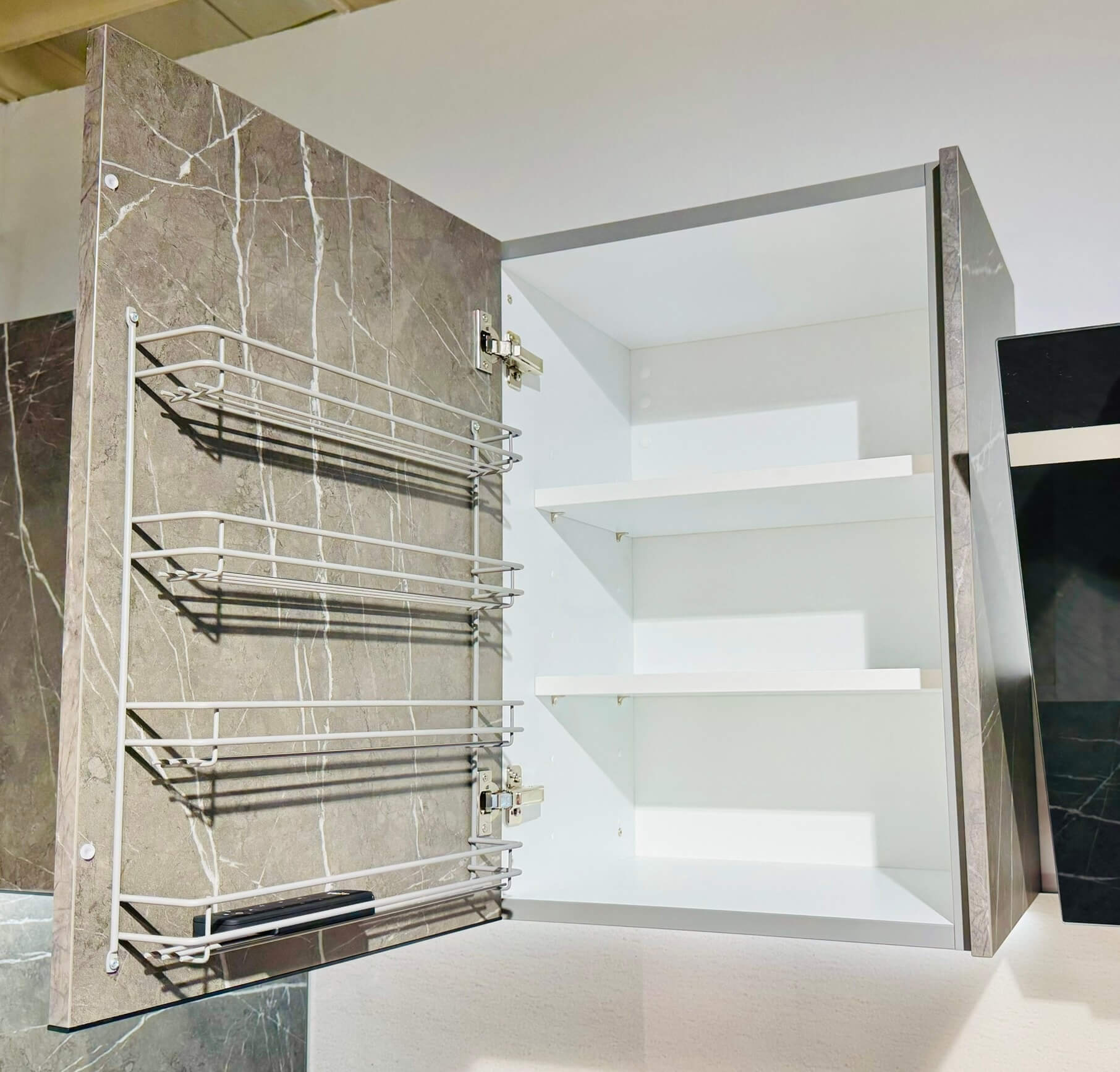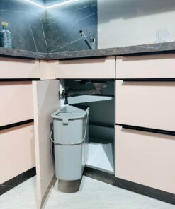 Die L-Form dieser Küche macht den Raum optimal nutzbar und ermöglicht effiziente Arbeitsabläufe. Die Anordnung von Spüle, Kochfeld und Arbeitsfläche folgt einem praktischen, ergonomischen Konzept, das jede Bewegung unterstützt. Die Oberschränke in Marmor Scuro Nachbildung schaffen Stauraum auf Augenhöhe und setzen dabei gleichzeitig einen stilvollen Akzent, der die Pastellrose-Fronten elegant ergänzt. Die Kombination aus offenen und geschlossenen Elementen sorgt für ein ausgewogenes Verhältnis von Funktionalität und Design.