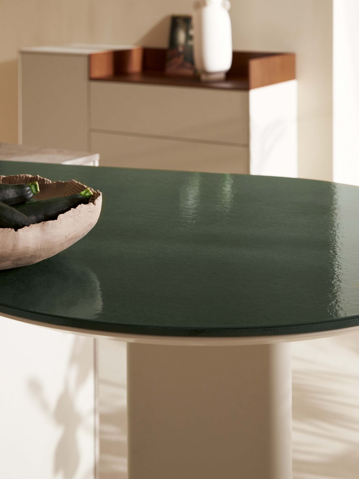 Der tropfenförmige Ansatztisch vereint Funktion und Design auf elegante Weise. Er lässt sich in zwei Größen und an verschiedenen Positionen einplanen und verleiht der Küche eine grazile Silhouette. Neu im Programm ist die Oberfläche LavaTech, gefertigt aus Feinsteinzeug und recyceltem Glas, mit feinem Handgefühl und edler Optik. Zwei Farbtöne stehen zur Verfügung: LavaTech Asparago glasiert (C4000) und LavaTech Corallo glasiert (C4010). Beide fügen sich harmonisch in das Gesamtbild moderner Küchen.