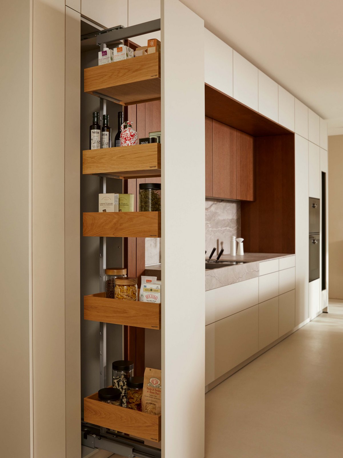 Integration Optimized führt Einbaugeräte konsequent in die Frontflucht und setzt das durchgehende Fugenbild präzise fort. Das Ergebnis ist eine ruhige, harmonische Optik ohne störende Unterbrechungen. Das Aufsatz-Pocketsystem ergänzt das bewährte Prinzip als Aufsatzschrank-Variante: Hinter den Einschubtüren verbirgt sich ein vollwertiger Arbeitsbereich, in dem sich Geräte, Technik oder Alltagshelfer unauffällig unterbringen lassen. Die Arbeitsplatte liegt hinter der Front und fügt sich präzise in die Zeile ein.
