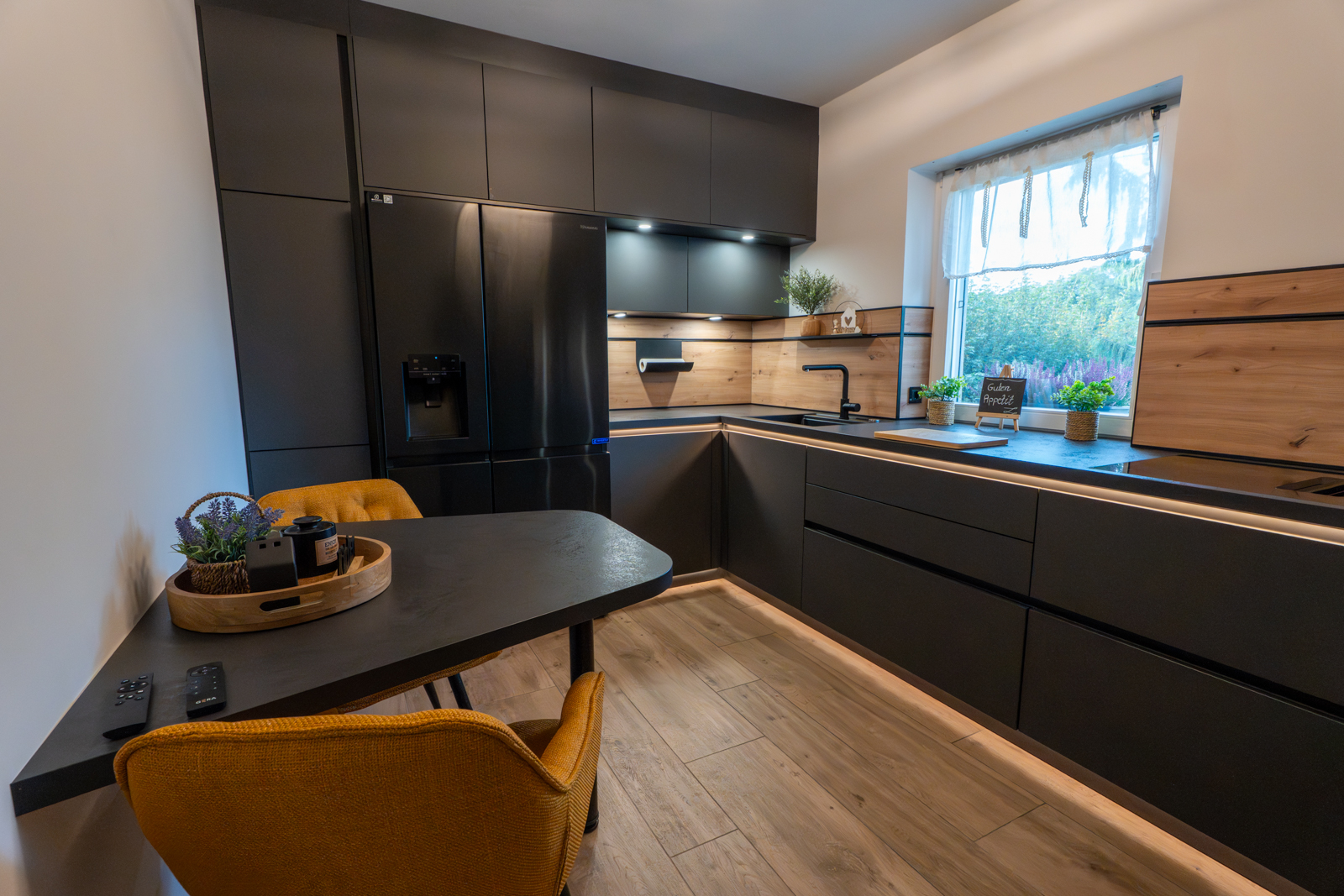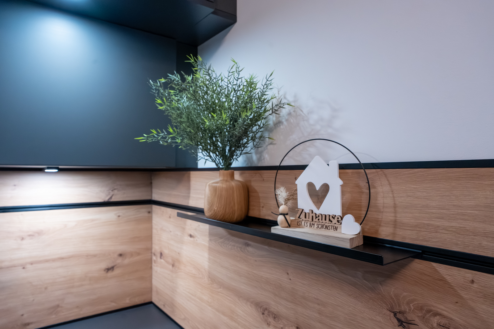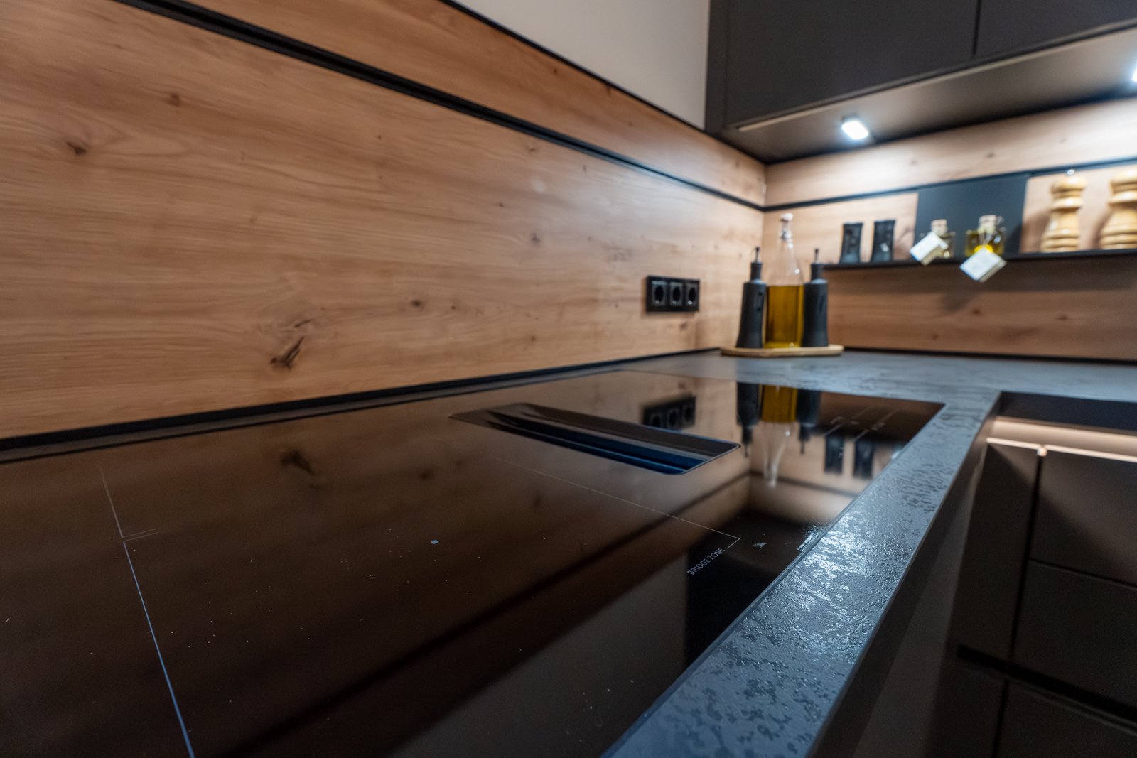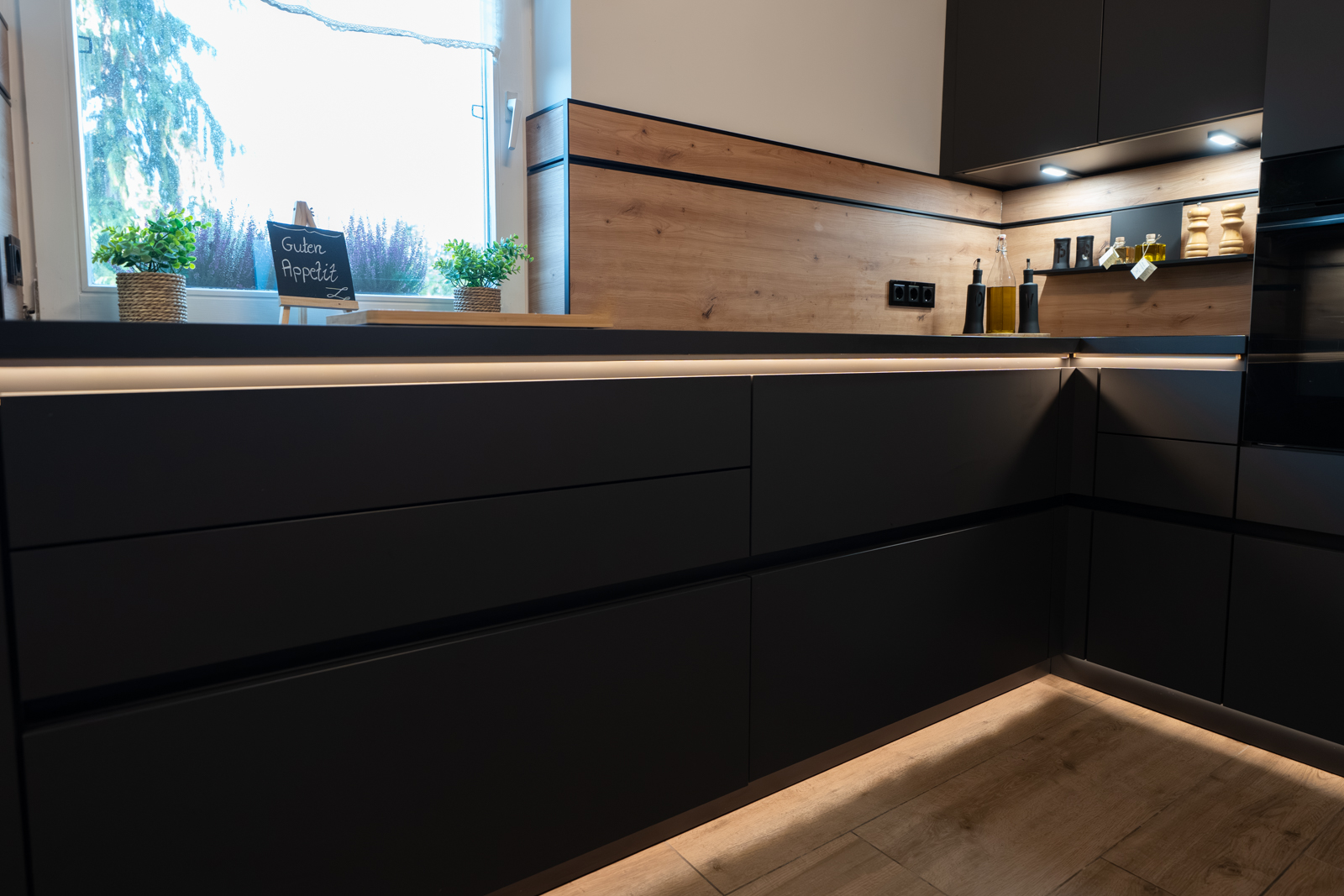 Wir planten eine Traumküche mit matter, dunkler, griffloser Front. Statt Fliesenspiegel setzten wir auf Zusammenspiel und Wirkung von warmen Holzakzenten, passend zum Boden. Im Dialog mit den dunklen Fronten entstand eine sehr besondere Atmosphäre, die in den Abendstunden durch den Einsatz indirekter Beleuchtung abgerundet wird. Ausgesuchtes Zubehör, Kochfeld mit Muldenlüfter, Spüle und Armaturen setzen dazu passende Akzente in Schwarz. Auch der trapezförmige schwarze Esstisch und die edlen Lederstühle passen wunderbar und bilden ein perfektes Finish.