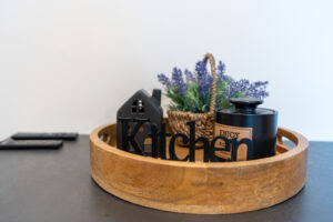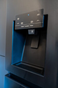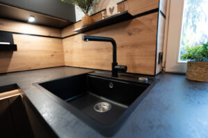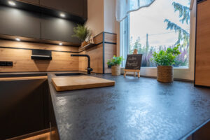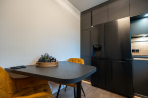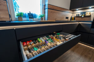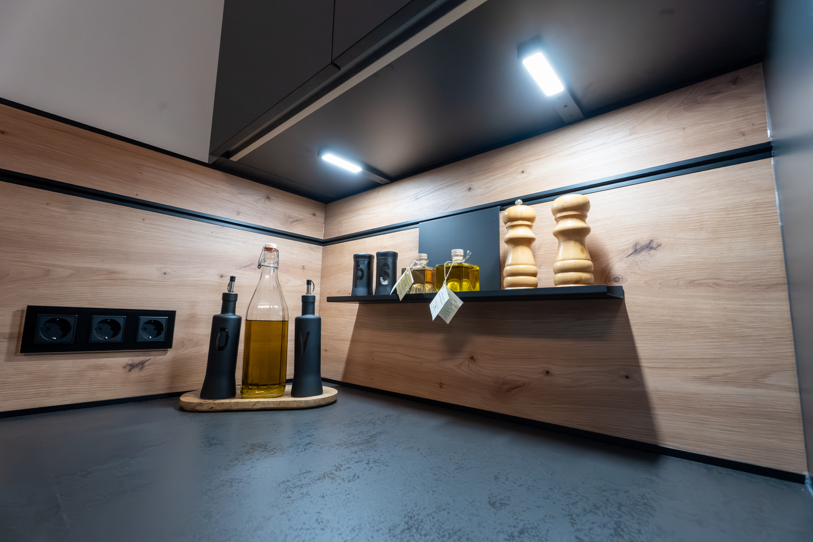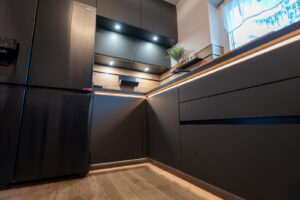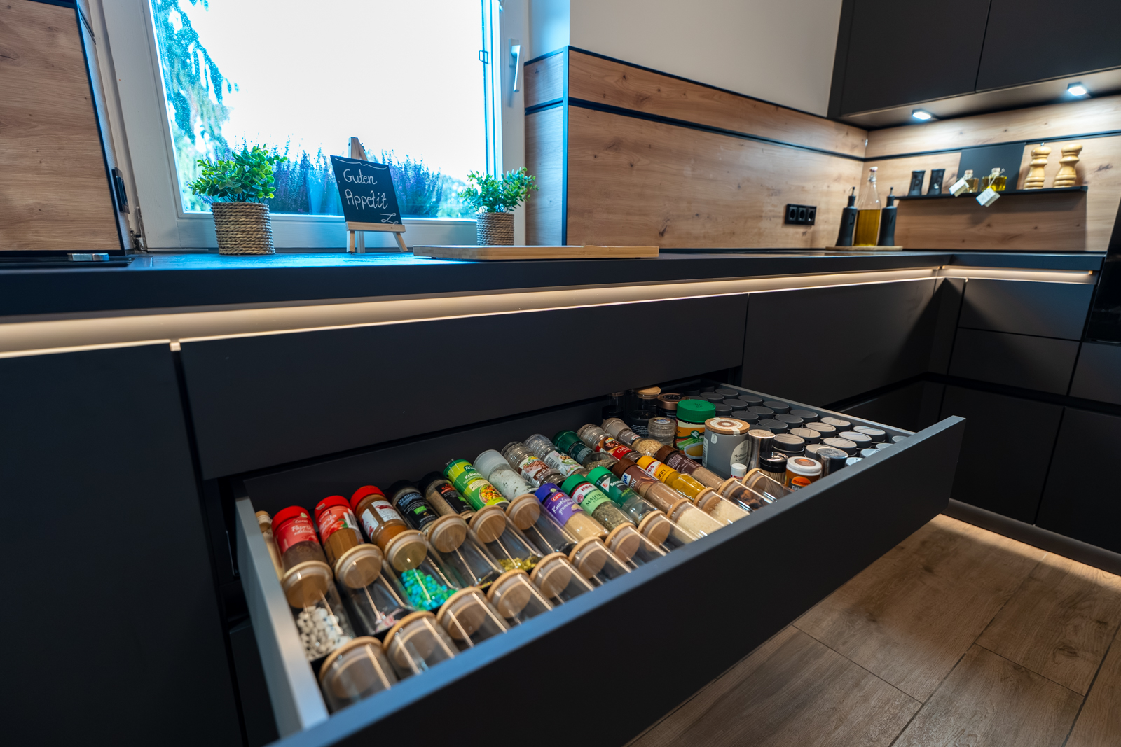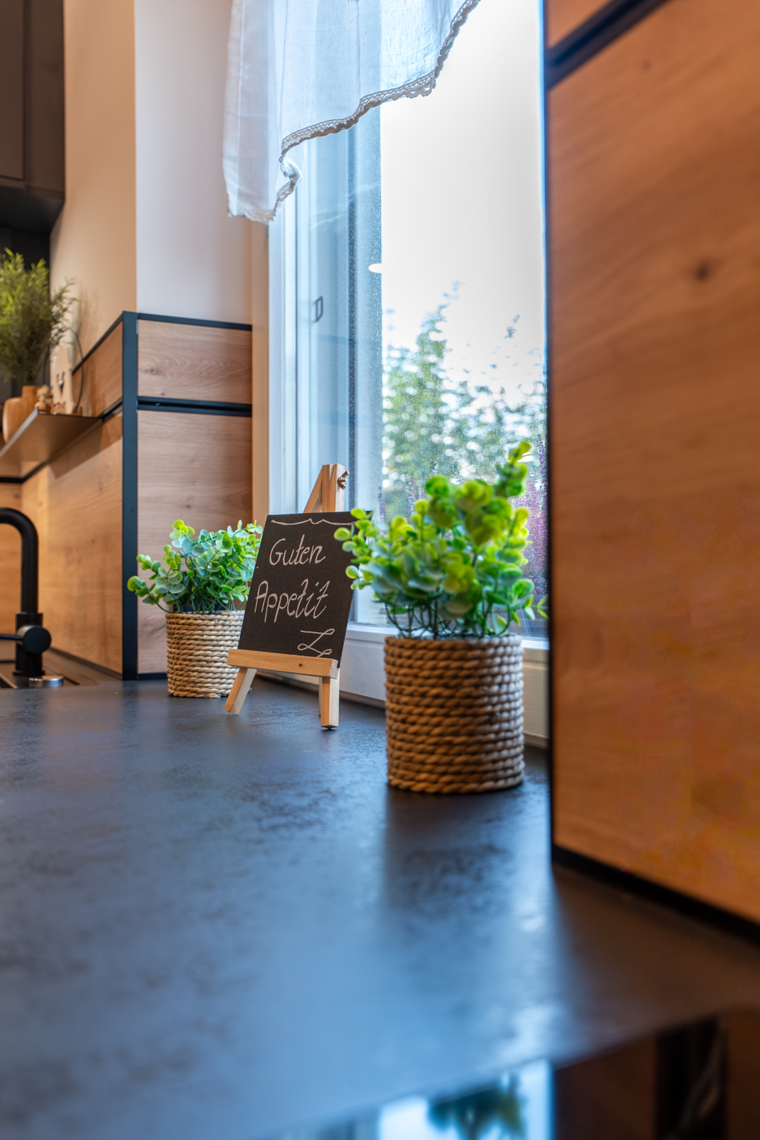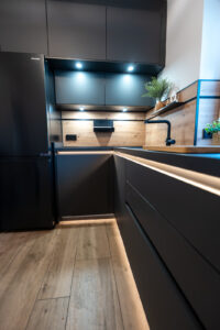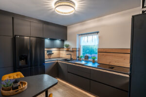 Wir planten eine Traumküche mit matter, dunkler, griffloser Front. Statt Fliesenspiegel setzten wir auf Zusammenspiel und Wirkung von warmen Holzakzenten, passend zum Boden. Im Dialog mit den dunklen Fronten entstand eine sehr besondere Atmosphäre, die in den Abendstunden durch den Einsatz indirekter Beleuchtung abgerundet wird. Ausgesuchtes Zubehör, Kochfeld mit Muldenlüfter, Spüle und Armaturen setzen dazu passende Akzente in Schwarz. Auch der trapezförmige schwarze Esstisch und die edlen Lederstühle passen wunderbar und bilden ein perfektes Finish.