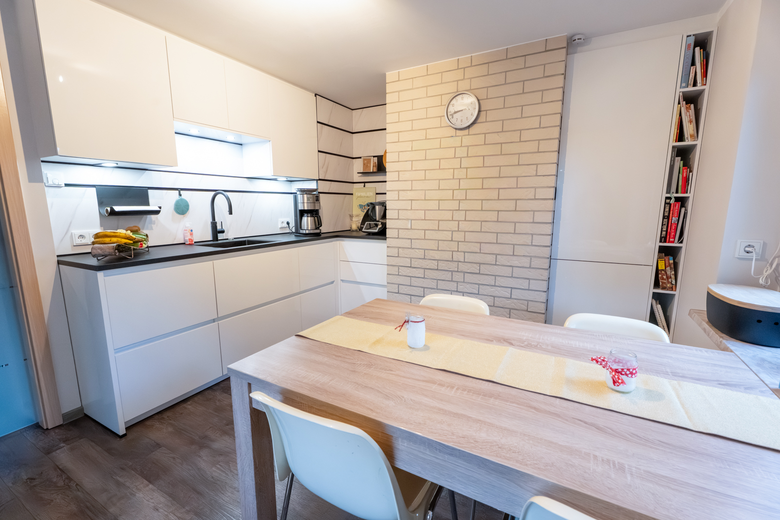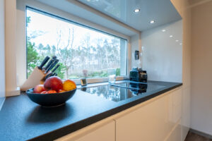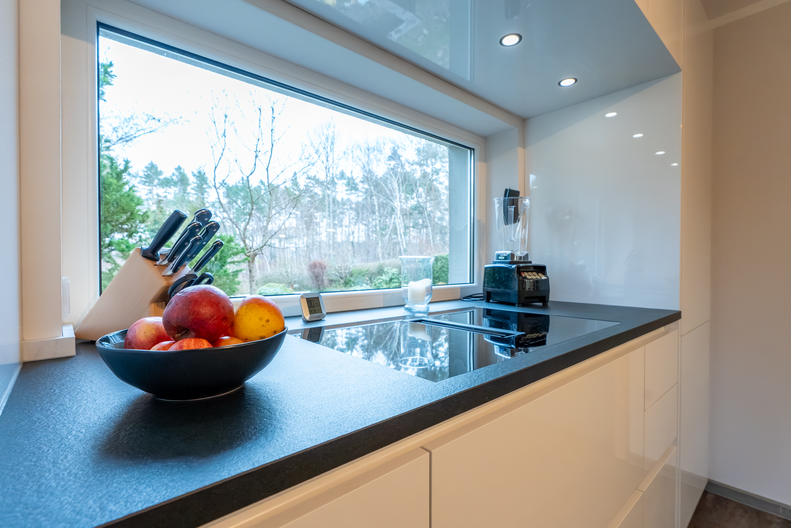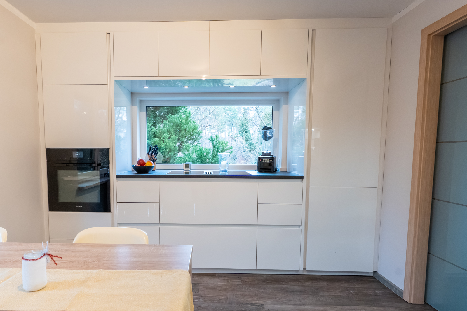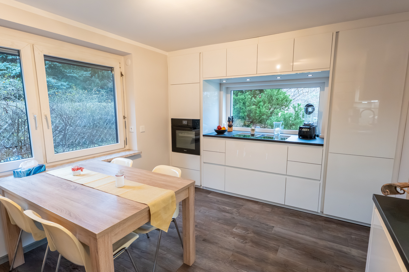 Wir schlugen eine grifflose Küche mit Hochglanzfront und flächenbündigem Einsatz von Spüle und Kochfeld vor. Um das Kochen zu einem ganz besonderen Erlebnis zu machen, wurde gleich hinter dem Kochfeld ein zusätzliches Fenster eingebaut, sodass man beim Kochen hinaus ins Grüne schauen kann. Gleichzeitig verwandelt sich die Küche durch zwei weitere Fenster an der angrenzenden Wand in einen freundlichen, lichtdurchfluteten Raum und somit zu einem echten Zentrum des Familienlebens.