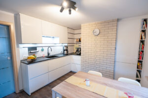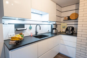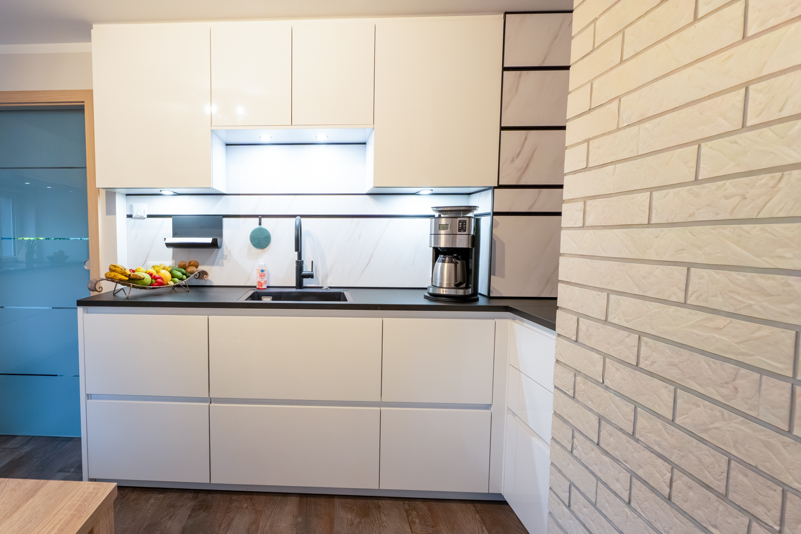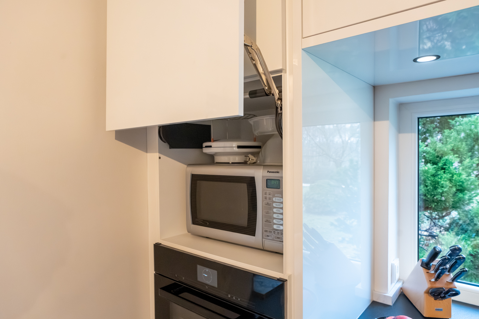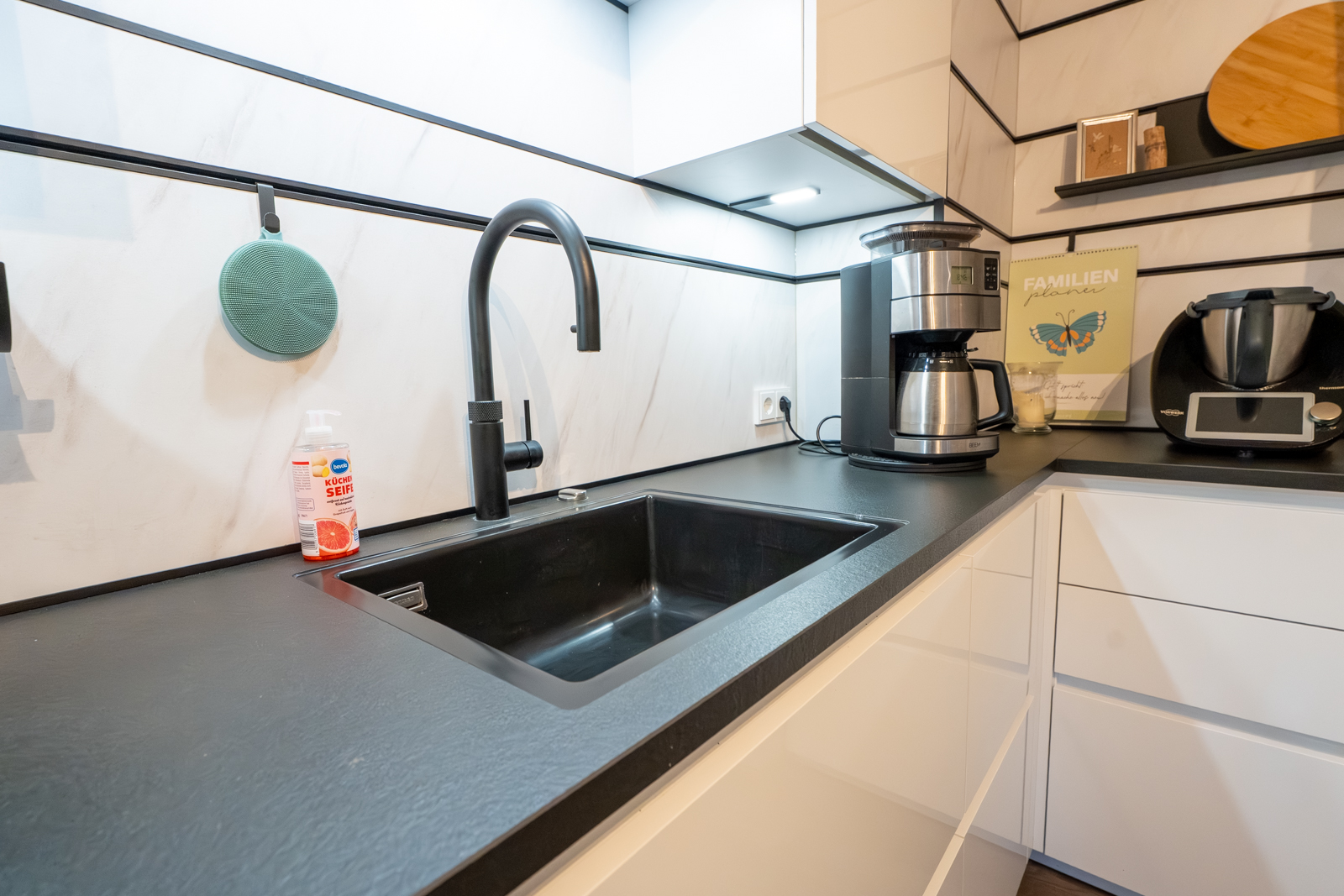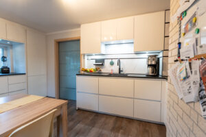 Wir schlugen eine grifflose Küche mit Hochglanzfront und flächenbündigem Einsatz von Spüle und Kochfeld vor. Um das Kochen zu einem ganz besonderen Erlebnis zu machen, wurde gleich hinter dem Kochfeld ein zusätzliches Fenster eingebaut, sodass man beim Kochen hinaus ins Grüne schauen kann. Gleichzeitig verwandelt sich die Küche durch zwei weitere Fenster an der angrenzenden Wand in einen freundlichen, lichtdurchfluteten Raum und somit zu einem echten Zentrum des Familienlebens.