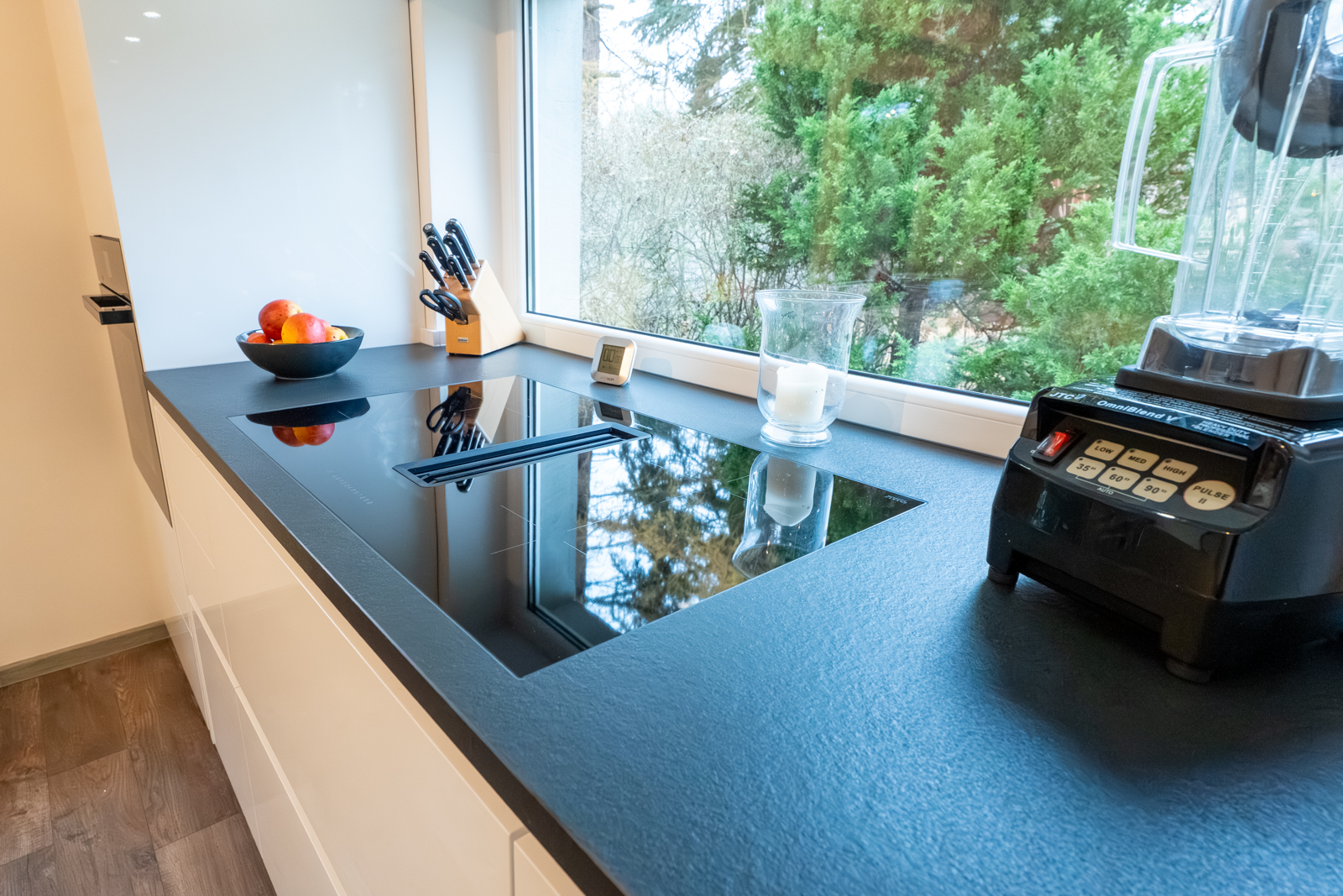 Um den Wunsch nach Stauraum bestmöglich zu erfüllen, haben wir sie deckenhoch geplant, mit vielen Schränken, Schubfächern und Regalböden. Außerdem haben wir das Kochfeld mit einem Muldenlüfter versehen, sodass statt der üblichen Dunstesse über brutzelnden Pfannen und dampfenden Töpfen weitere Schränke plus Kochfeldausleuchtung Platz fanden.